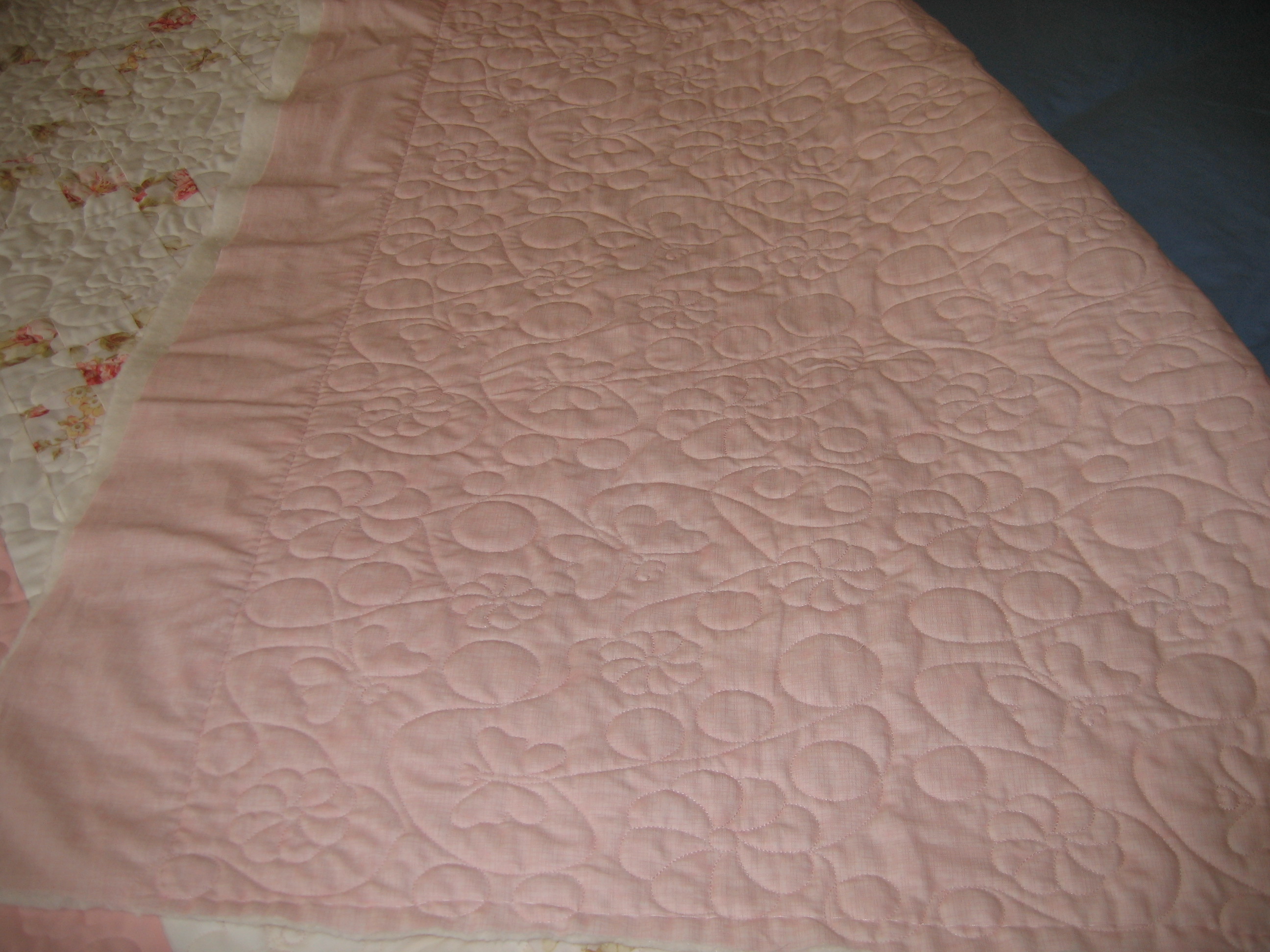 Claudia O: Your quilt is beautiful. It looks very vintage. Your "pink loving friend" will be thrilled with it I'm sure. Quilting is so detailed and exacting that I have really never tried it but I do admire quilted things and all the time spent putting it altogether. I have three quilts that my grandmothers and mother made and have them hanging in our bedroom on a quilt holder that my husband made for me.