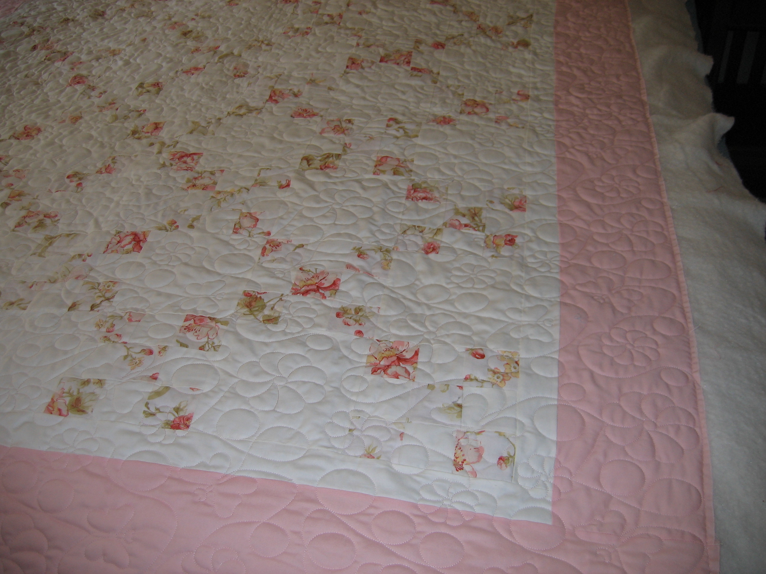 Claudia O that quilt is pretty and reminds me of one my aunt made years ago- she cross-stitched pink and dark pink roses all over a white background for the top. She used it in her bedroom-she was unmarried- with white painted furniture, trim and doors, and wallpaper in an all over pattern of small pink roses on white background. That quiet, serene room always charmed me. Thanks for the memories.