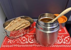 We're currently traveling by train. Since it's an 8-hour journey, we packed some food. For lunch, we'll have warm chili and hot tea.