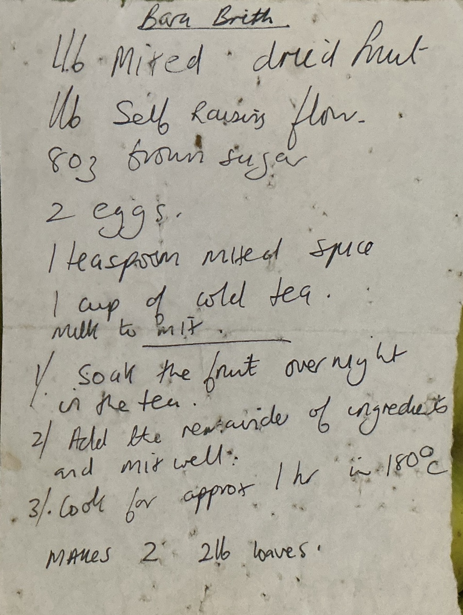 Bara brith is my standard cake, baked when the oven is on for a Sunday pot roast. The soaked dried fruit eked out with grated apple or carrot, sometimes made with sultanas and a spoonful of marmalade, (I save the last of a jar of jam or honey to rinse out with tea for the Bara brith,) a teaspoon of black treacle with cheaper white sugar, or malt extract in place of most of the sugar. Midwife Mary Thomas wrote her mother’s recipe for me on a busy night shift about 30 years ago. It is probably a wartime recipe, not using any of the fat ration.