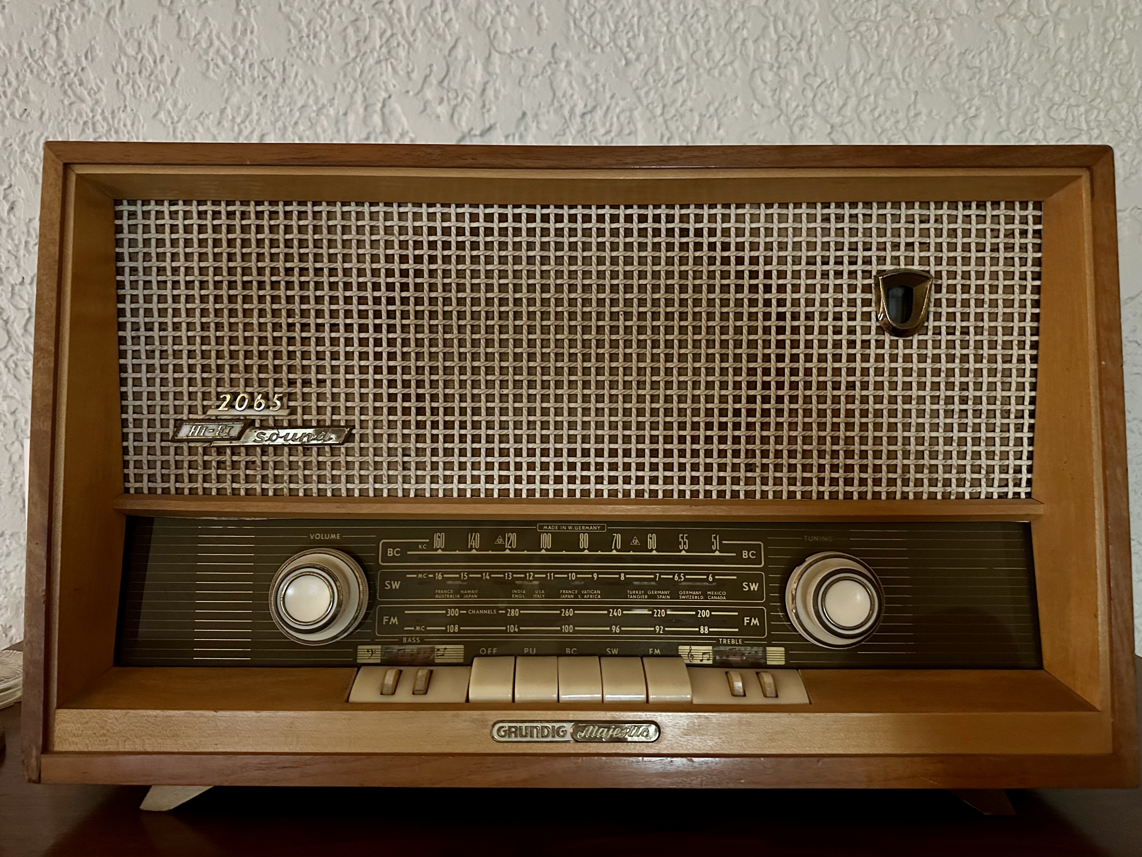 Our house is 100 years old, that puts us in the 1920s.  Some of my cast iron and Pyrex is from the 1930s, and some is new.  We have furniture from the 1940s and forward, most of it from before 1980.  My sterling flatware is from 1941, and my china is of the same vintage.  The 1940s and 1950s provide our radios, and luckily we live where radio is still broadcast and have a choice of stations.  Our record player console is from the 1960s, but has also been updated to allow streaming from a smartphone.  The 1970s provide more vintage housewares, books, and sewing/craft supplies.  We married in the 1980s, and still use some of our wedding gifts on a regular basis.  My KitchenAid mixer is from the 1990s, as are our knives and many other of our home goods.  All of our large appliances are from the last 10 years — we experienced many of them breaking at the same time.  I have a bin full of antique and vintage linens.  We have record albums from all decades.
