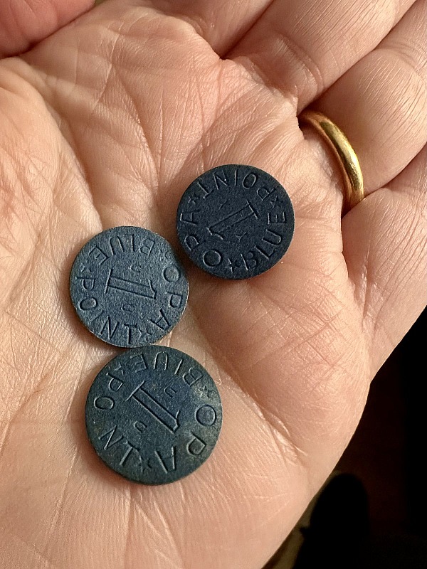 I have 3 of the little ration “coins” that were given as change for the blue ration stamps.  These came from my grandmother’s jewelry box.  She was in her late 30s during WW2.  Unfortunately she died when I was a teenager, before I was interested in her history, so I don’t have her stories.  She was introverted and didn’t really ever talk about herself.  My other grandmother was about 13 when the United States entered the war after Pearl Harbor, so she did have some stories to share.  She knit bandages, which put her off knitting for the rest of her life.  Her family did have a victory garden and her aunt planted food everywhere she could find a few inches of dirt, including planting onions along the side of the garage in a bed only 8 inches across.
