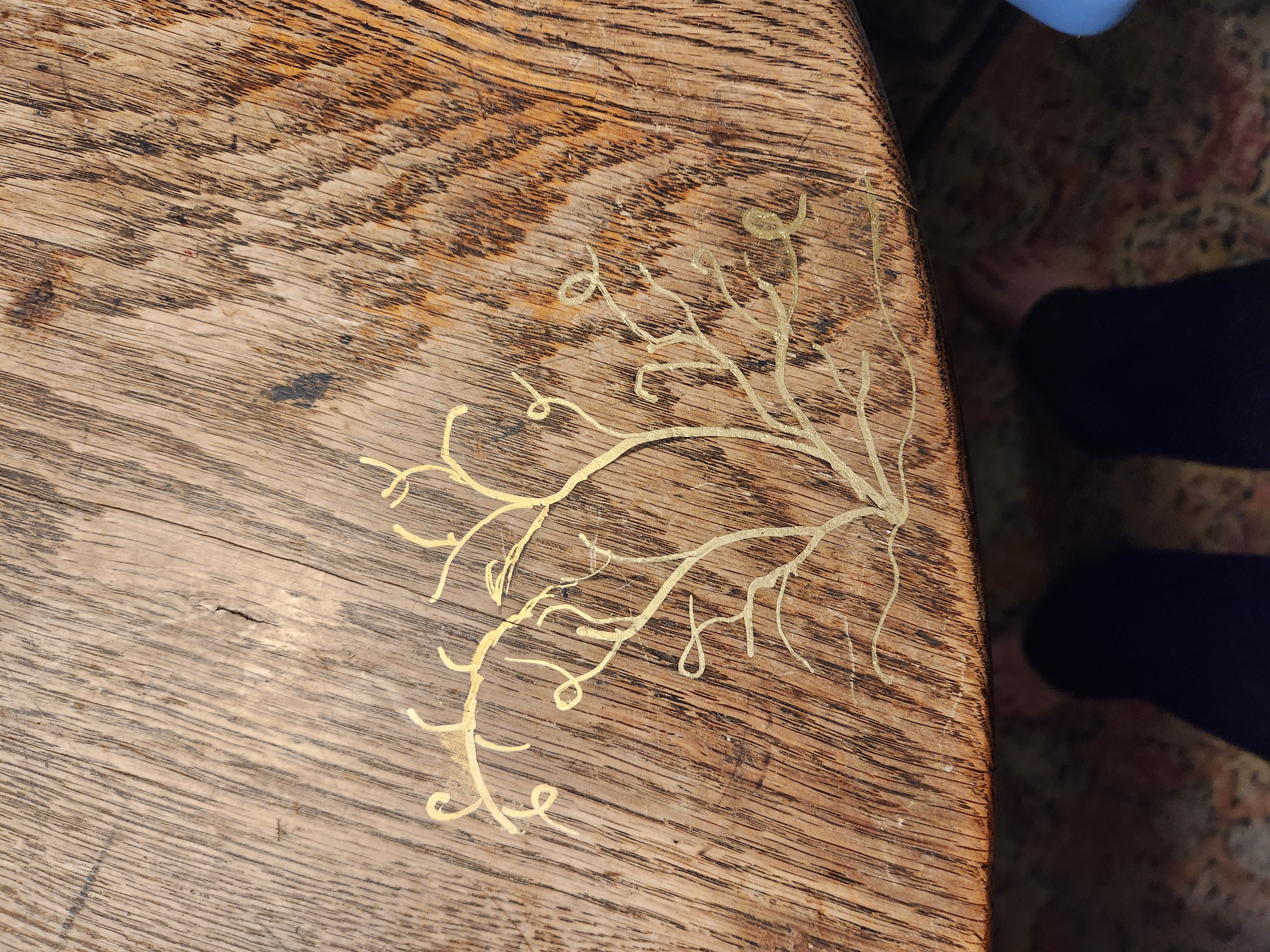 Bought gold markers from Amazon (I later read they weren't recommended for wood but they actually worked fine). I kind of filled in the deep scratch and enhanced it a bit an while I was at it did the same for another part of the table that had some scratches. I was so happy with the way it came - the gold picks up the light and shimmers and I love it!
