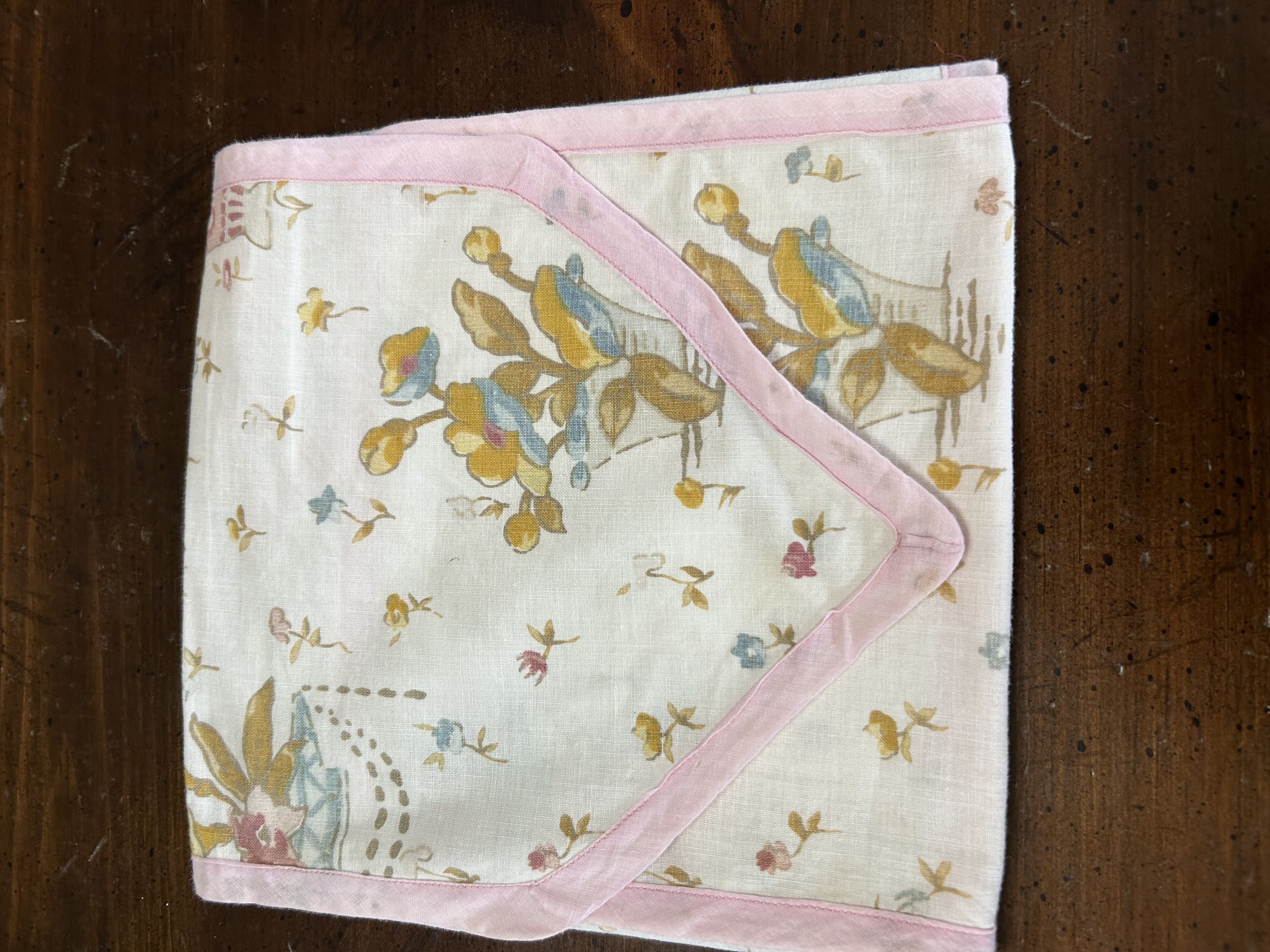 I do have something I think you would like or be interested in. It is for napkins so they stay fresh and clean. It’s about 9” square and the bottom has cardboard in it that I can almost read through the fabric. I have another one that’s larger- about 14” square for table cloths.
