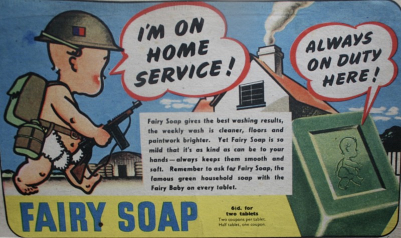 It is the same with soap, the ration is barely enough for one. The household soap was used for the laundry, the dishwashing, and all of the cleaning. The quarry tiled floors were scrubbed with soap and water. There was a very limited choice of soap available in the war, manufacturers started to place advertisements saying that their soap was longer lasting.