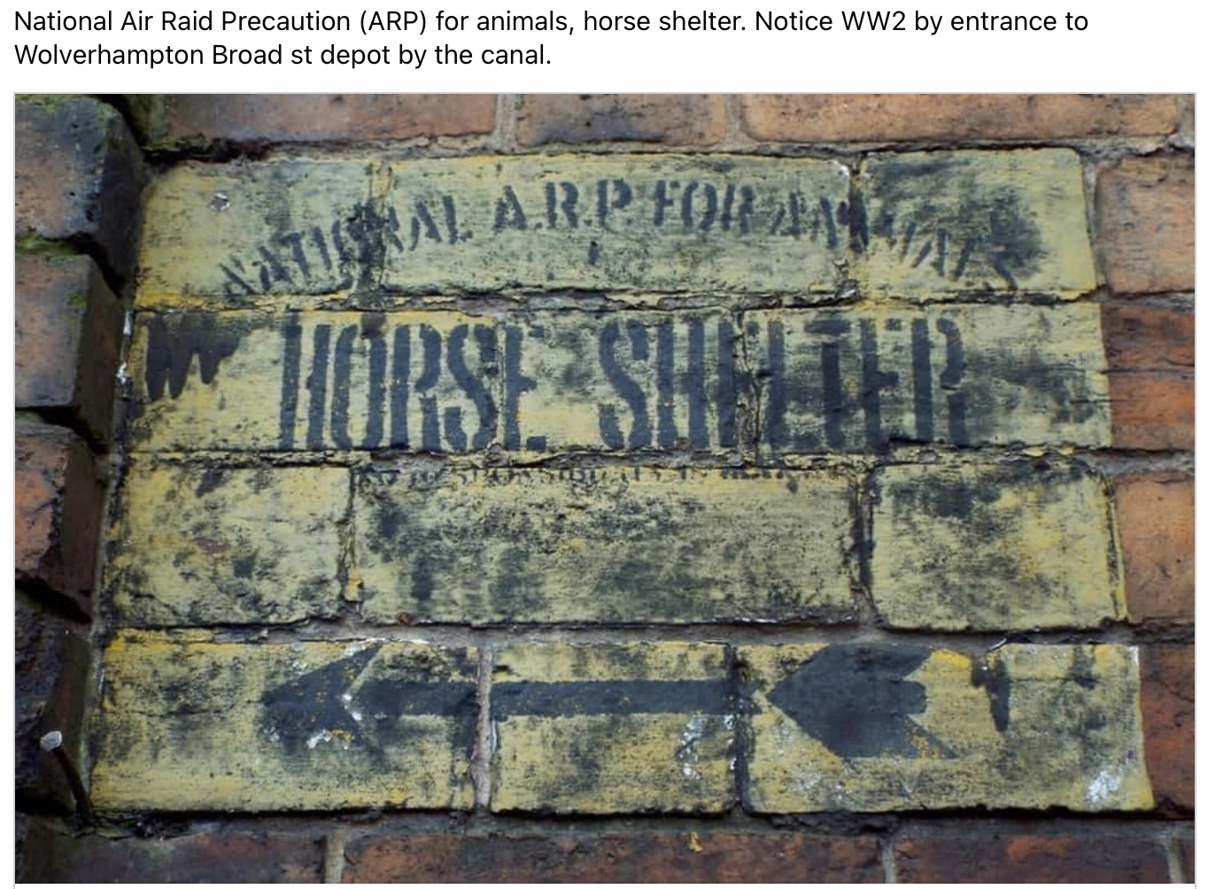 One of the London Mass Observation diarists records the horse being unharnessed from the cart and taken into the entry, a narrow passage leading to the back yards, between the houses in a terrace, to shelter when the air raid sirens warned of daytime bombing raid. The painted sign directs the canal bargees to the bomb shelter for horses. Many women took over the canal work taking cargoes of coal and heavy or fragile items by the canal navigation, often on the narrowboats still drawn by a carthorse from the towpath. They had small living accommodation behind the cargo area on one narrowboat and towed a second, skilled work managing the heavy lock gates to negotiate hills. The potteries in Staffordshire relied on the canals.