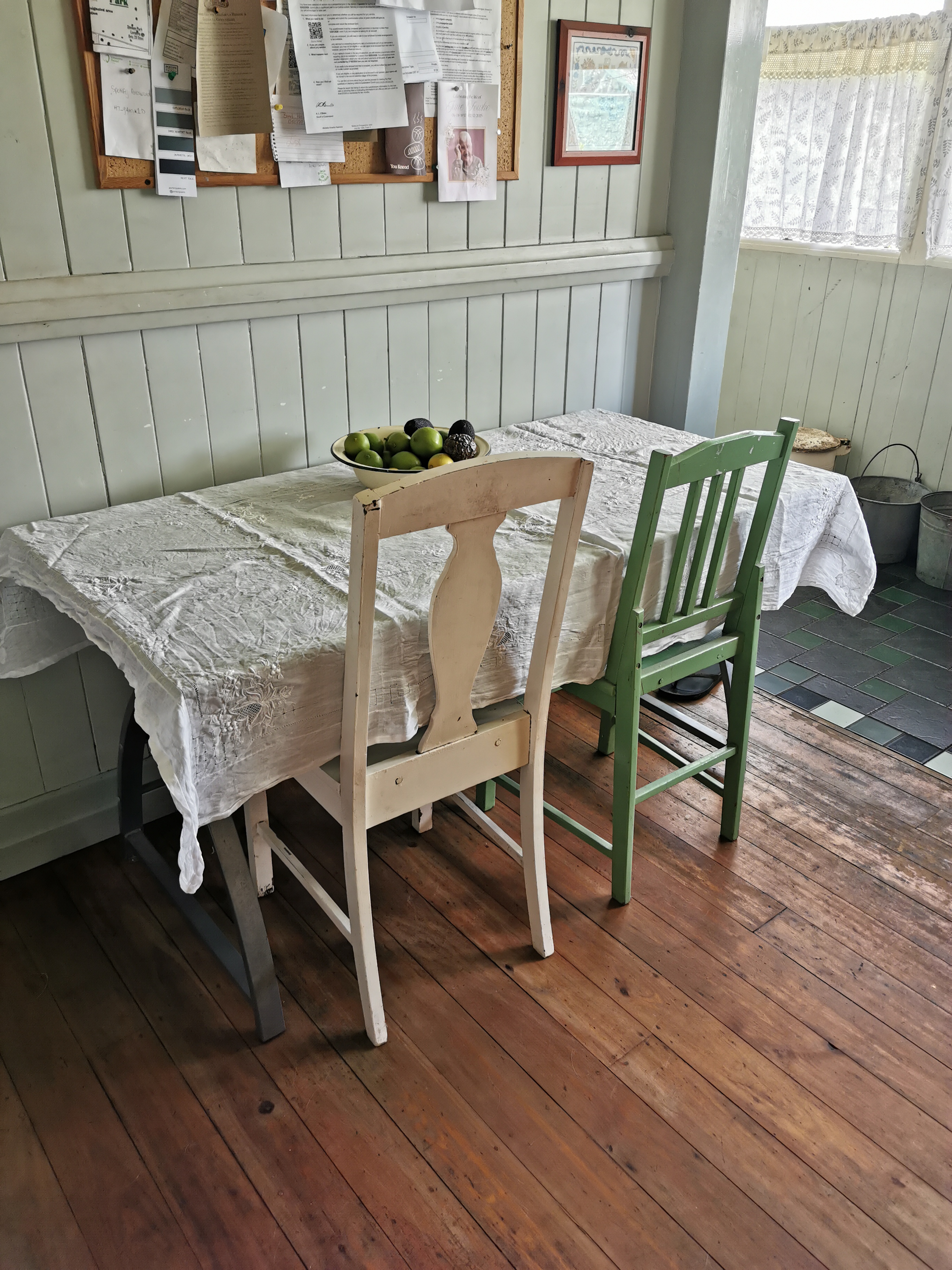 When our youngest child moved out last month we gave him our large lounge and kitchen furniture as we do not need such large items for the two of us. We kept our son's computer table that he was going to put out in hard rubbish, put a pretty tablecloth on it and added two old kitchen chairs we had lying around and we like it just fine.