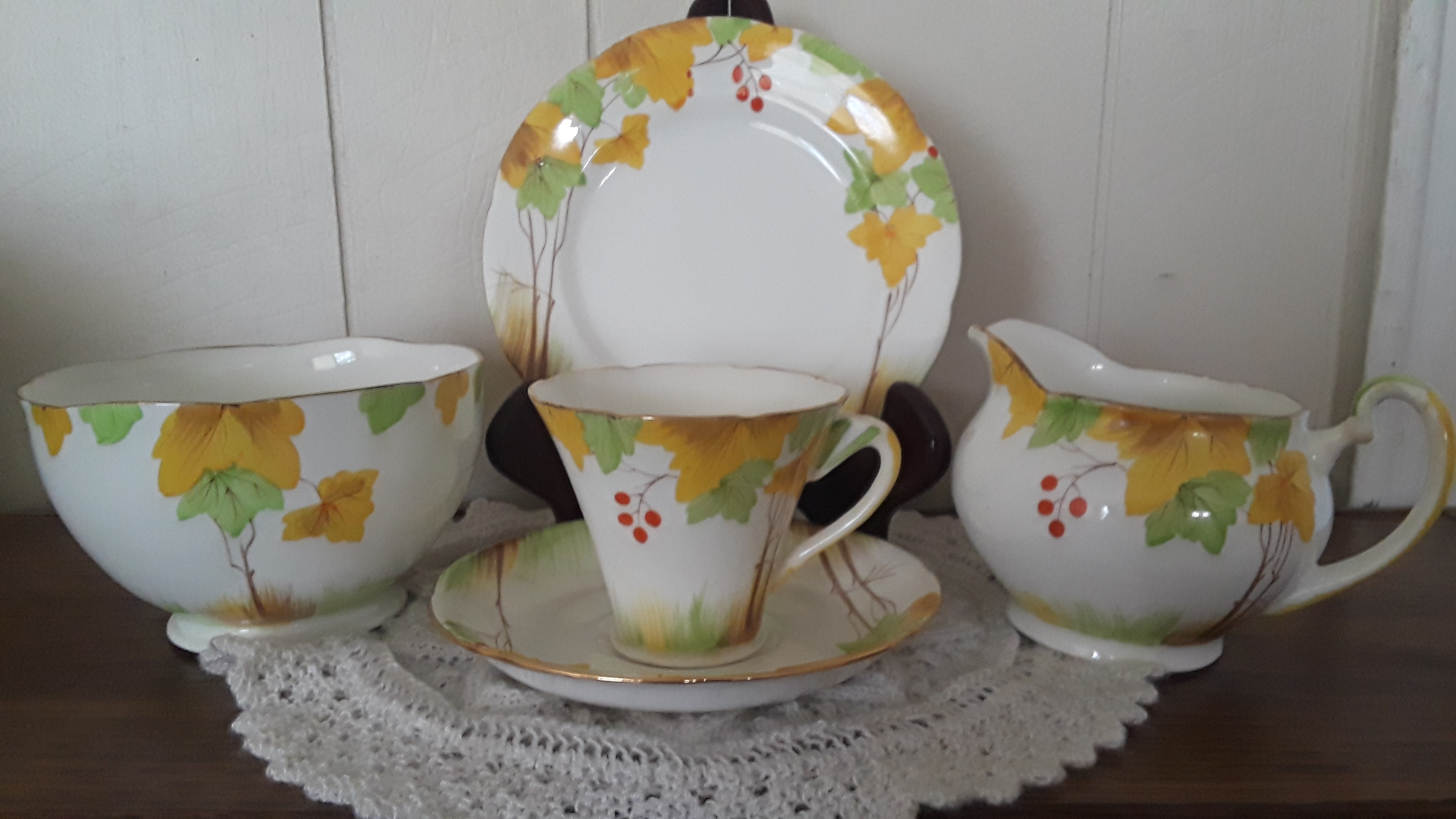This is the tea set my grandmother gave to me. It is from 1932. The cups are a "tulip" shape. I've never seen another one like it. She also knitted the doily underneath.