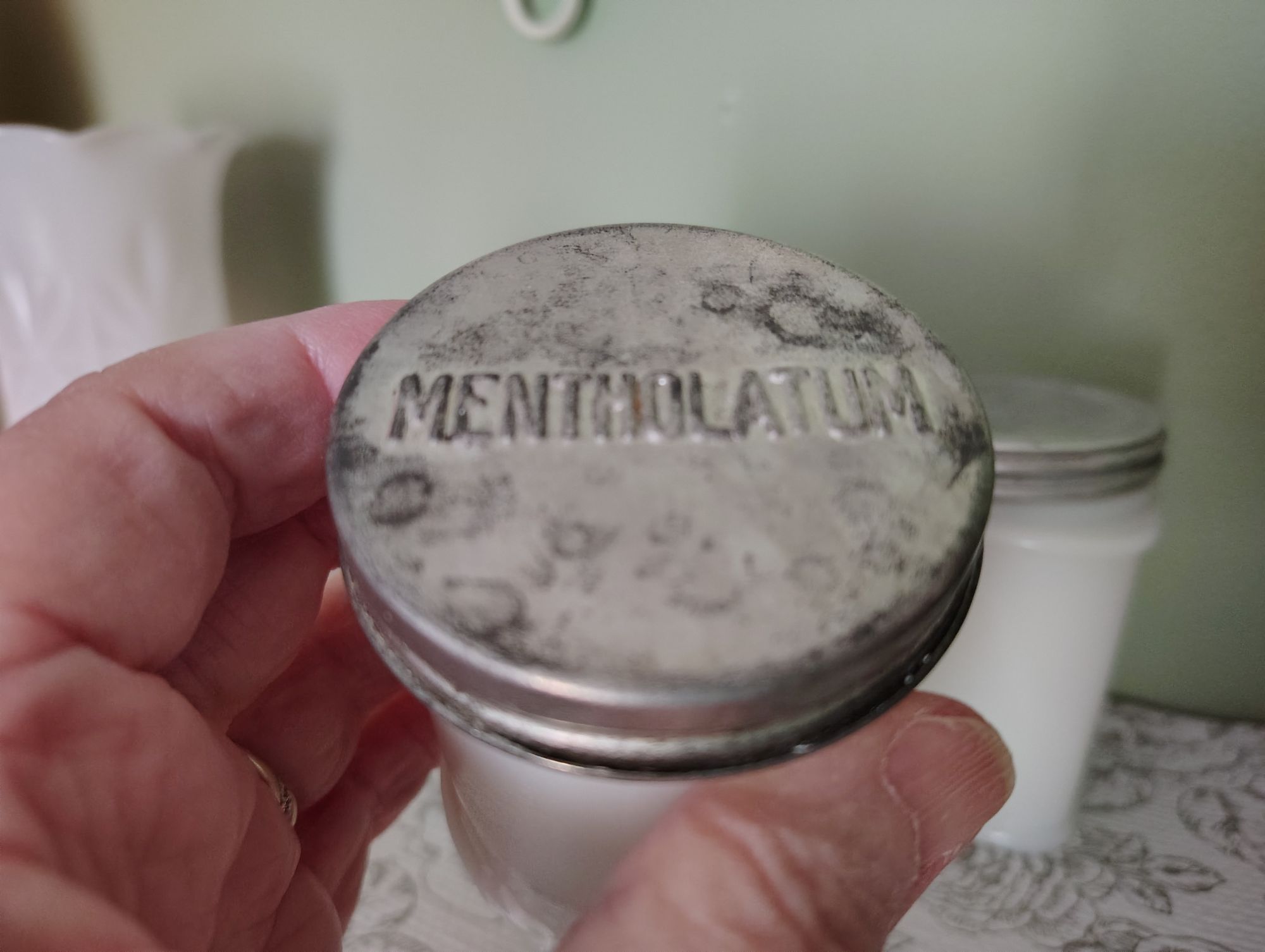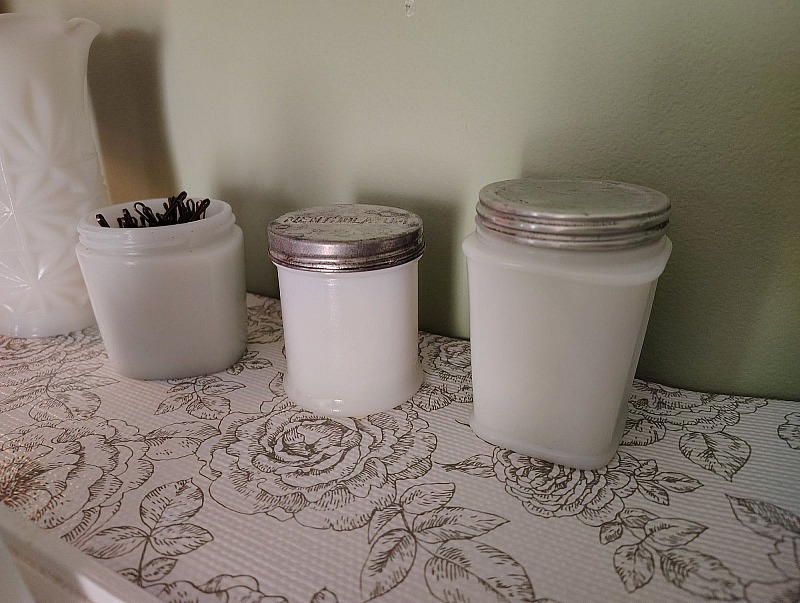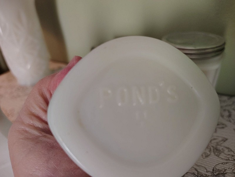 Rose M, yes, mine are all white milk glass.  The photo of the three lined up are from left to right, ponds cold cream, I do not have a lid for that one, a very old milk glass mentholatum jar and I transfer our vicks from the plastic jar to the vintage milk glass jar. The lid says MENTHOLATUM.  The one on the right is a vintage milk glass French cold cream jar.  Today when I looked on ebay to see if they had some ponds jars and found they did have several, I purchased one with a lid so now I will put some body lotion in the French lotion jar and move the ponds to the new vintage milk glass ponds jar with a lid and continue to keep my bobbie pins in the one with no lid. :)  I like removing the contents from plastic to milk glass. Just feels right.  :)  I have another apothecary milk glass jar I use for tylenol.  It is a narrow taller jar.