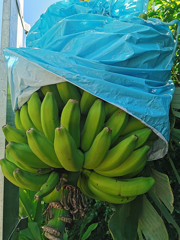 Bananas because they are a versatile high yield producing fruit. They only take 12-18 months to flower and set fruit. Permaculture teacher Linda Woodrow blogged recently about picking a bunch of hers green to turn into flour. Bunches produce between 150-200 bananas on average so good to trade or share. Good source of carbohydrates and starch. Spent plants rot down to make wonderful mulch in garden beds. They take up very little space in the garden. (Each plant only fruits once and then must be cut down. You pick the strongest sucker to make the next plant).