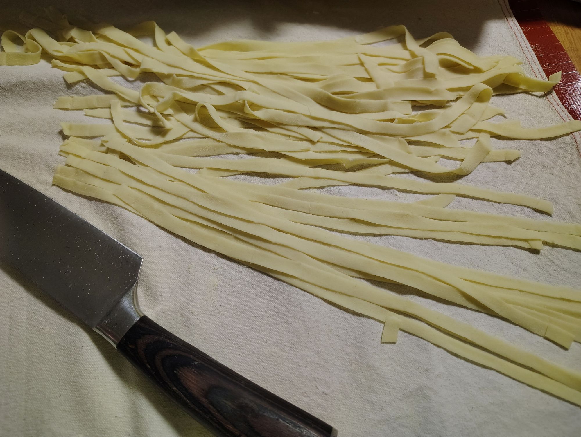 This time I made noodles without eggs.  This was so simple, just flour, warm water, a pinch of salt. Knead until a nice soft dough (not too soft) and cut into strips.