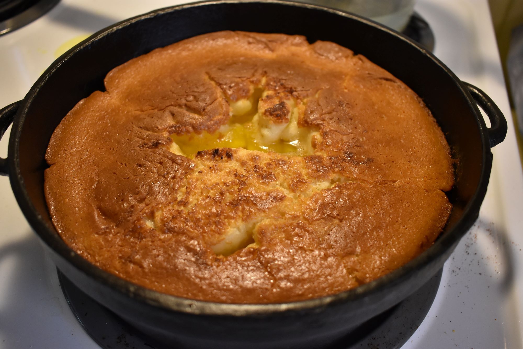 If you had a Dutch oven (cast iron pot with lid) do you know how to bake in it without a stove?  Could you make a fire outside and put hot coals on the top of the flat lid and bake this cobbler?