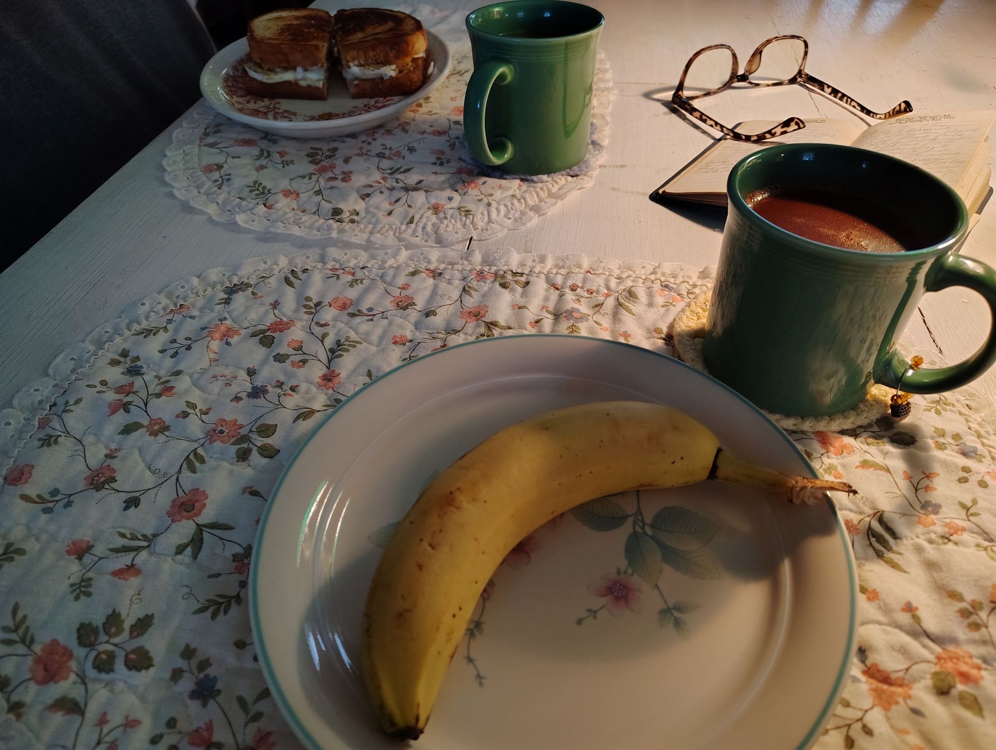 This particular morning I ate a banana and drank some hot chocolate.  Charles had an egg sandwich and coffee.