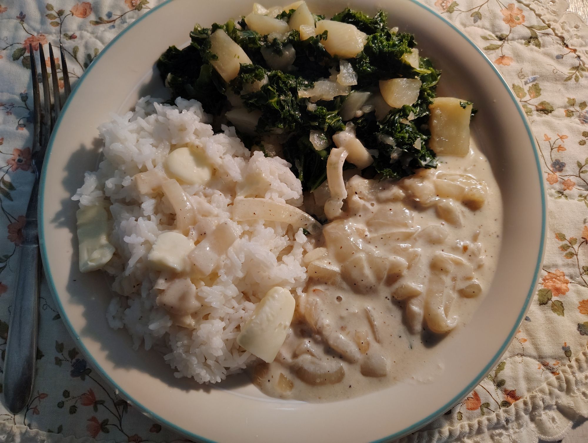 Creamed onions, rice and kale with turnip roots.
