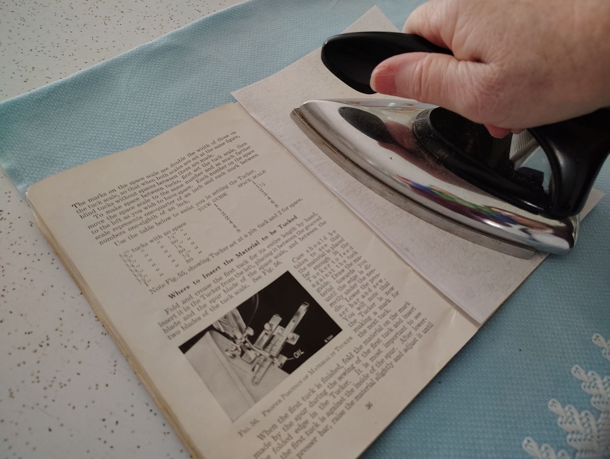 My mother always ironed our handkerchiefs, pillowcases and tops of the sheets.  She made sure I understood that ironing sanitizes.  I have spoke about this on my blog before about ironing handkerchiefs.  This is what gave me an idea to iron the book. Now the pages turn easier and the book does not feel dirty or smell.  I made a paper cover for it out of cardstock to keep it from flaking off pieces of the book.   I would caution you to do something like this at your own risk of ruining it but mostly use common sense when trying things like this.