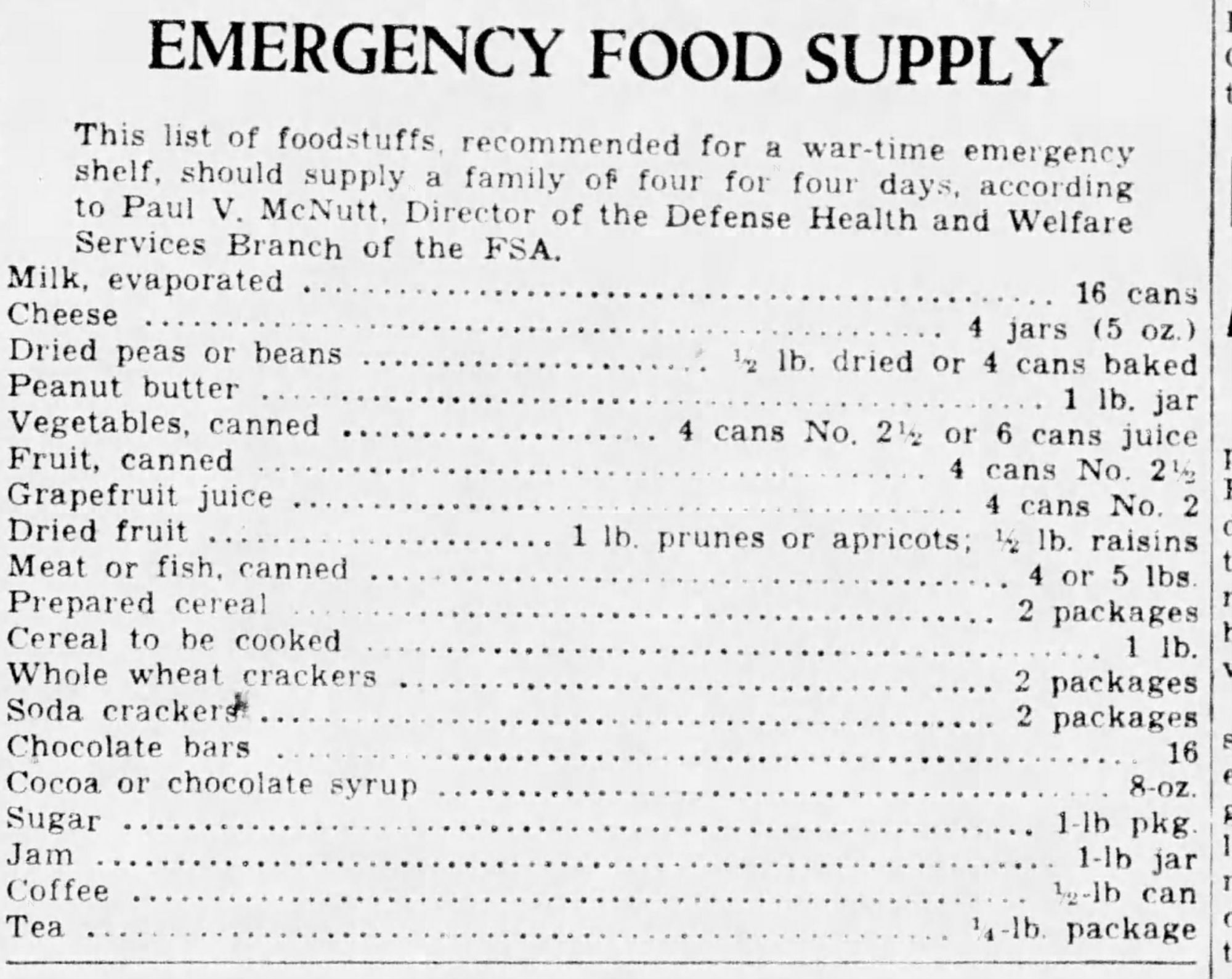 We stocked up because our 1942 newspaper suggested for people to stock up to have a four day supply of extra food.  I am not sure what they were thinking with this list of emergency food.