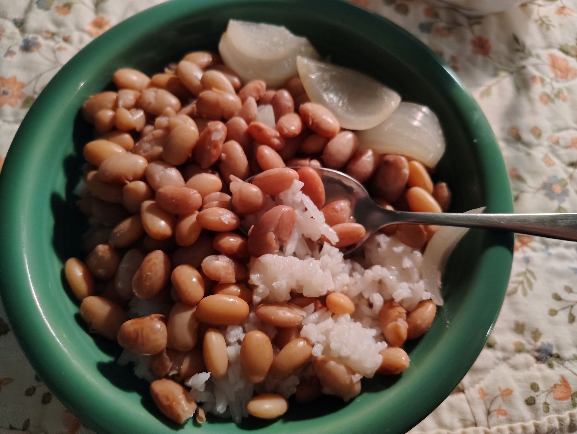 We find that cooking them this way we digest them better.  This is a very good simple meal of beans and rice.  The beans can be drained off after cooking them and saved for making refried beans, or put the beans over salad or in soup.  We used some of the cooking juice over the rice.