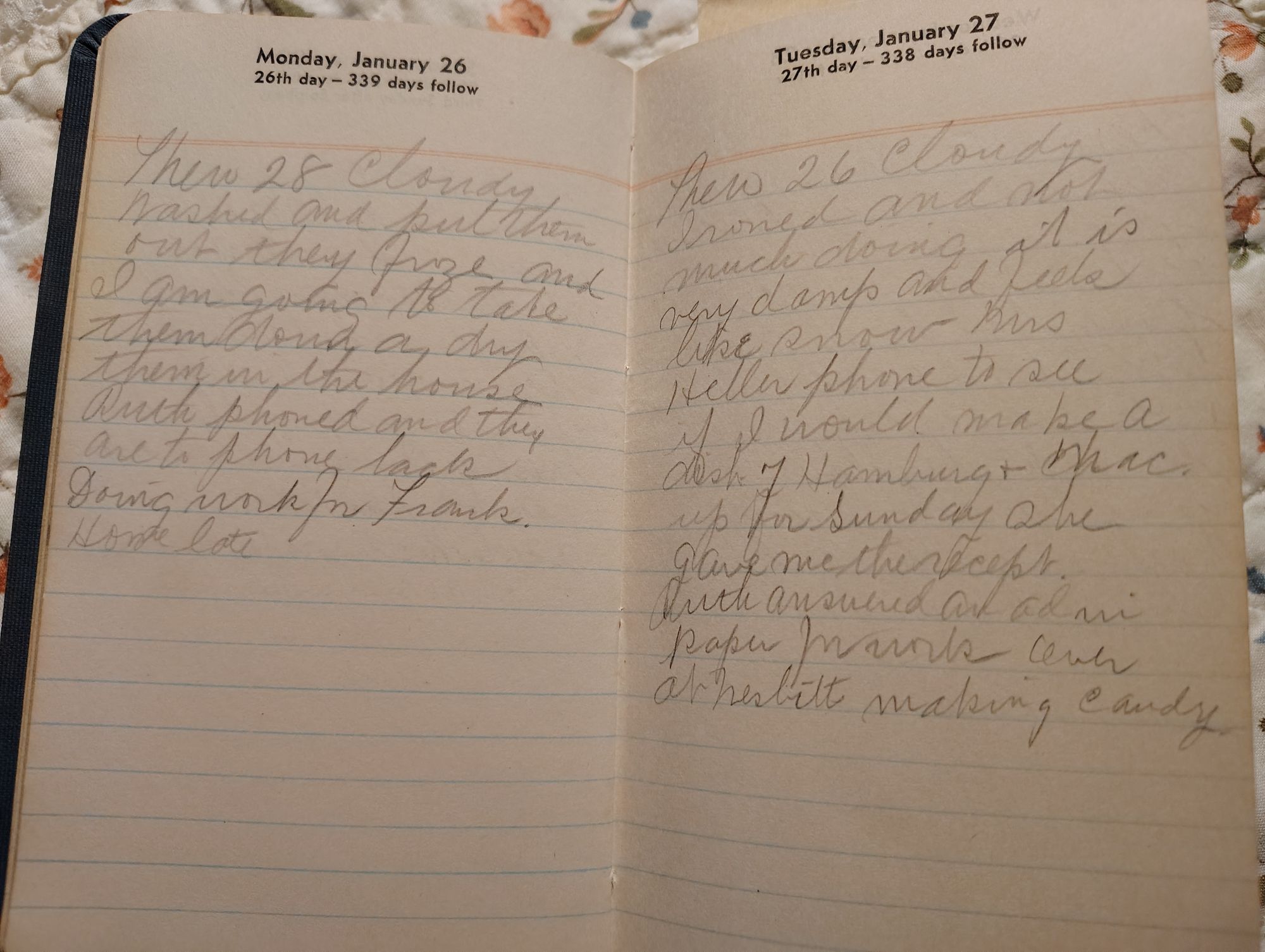 Monday Thero (temperature) 28 cloudy   washed and put them out they froze and I am going to take them down and dry them in the house Ruth phoned and they are to phone back   Doing work for Frank    Home late