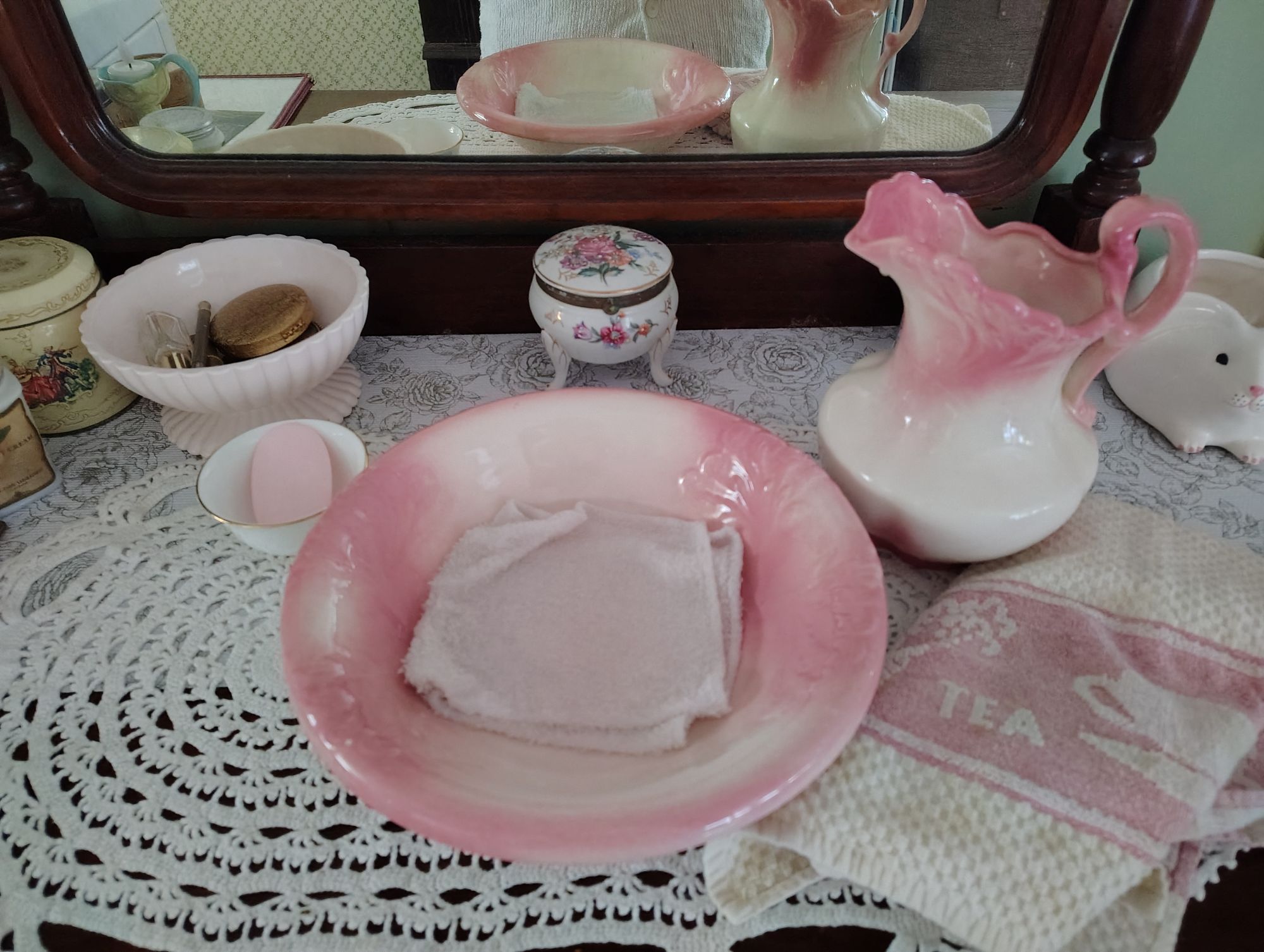 My daughter found a lovely small pitcher and basin while thrifting and brought it to me when she came up for the visit.  I am using it for morning wash up as a face bowl. It is very handy and feels a bit DejaVu or somehow like it is supposed to be.