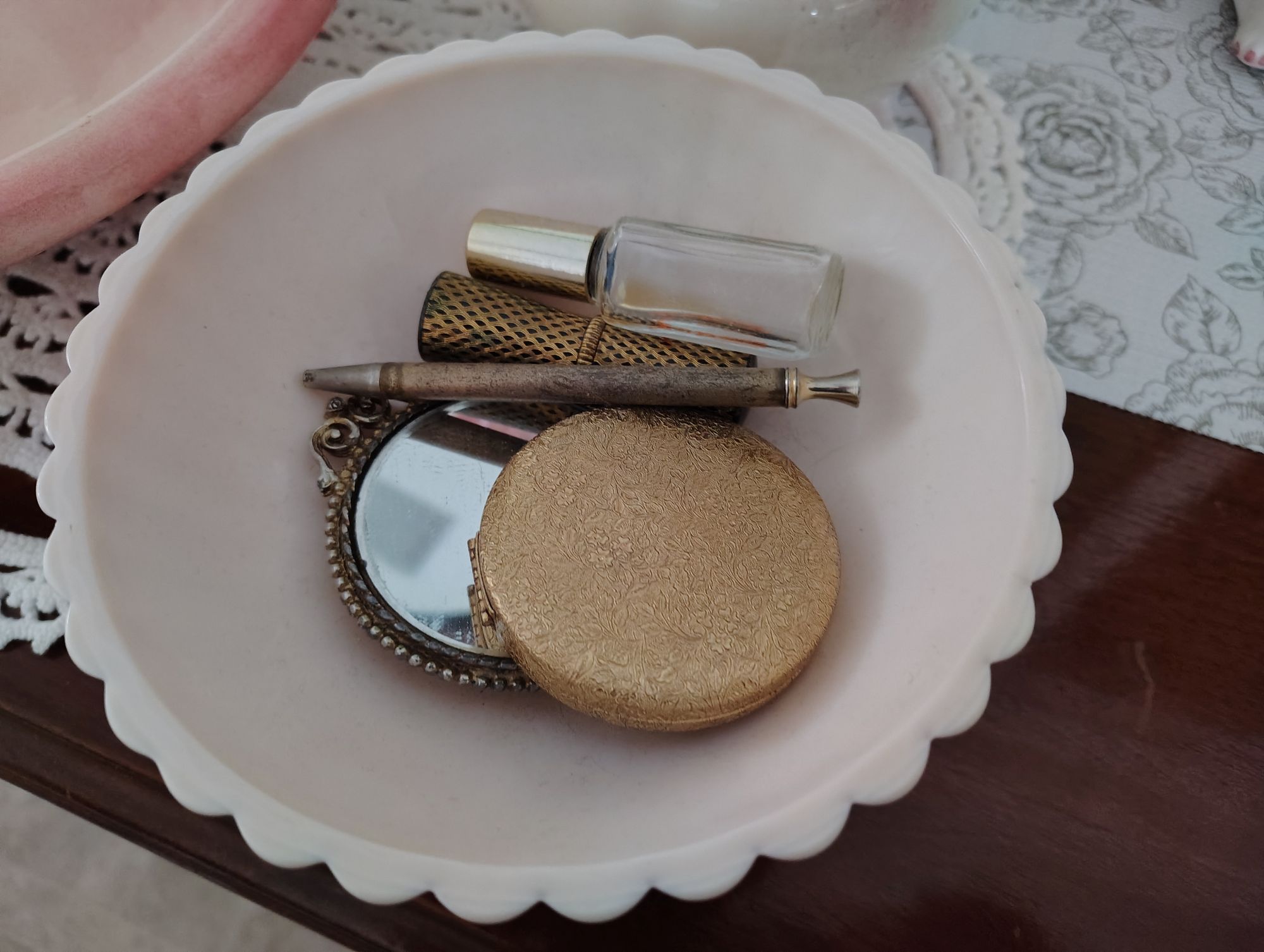 This past week in the forum we had a discussion brought up about Debby B's Memory Jar.  It is a wonderful idea of saving special memory items in a special jar that she has.  I am going to use that idea as well as others and the photo above is Some cosmetic items that belonged to Madge.  They were made long ago and speak of the era and how well even simple items were made.  I have been saving these since she passed away just for a memory.  I will now add these to my memory jar along with Charles Grandfathers spectacles and his wallet.  Thank you Debby B for sharing about your jar.