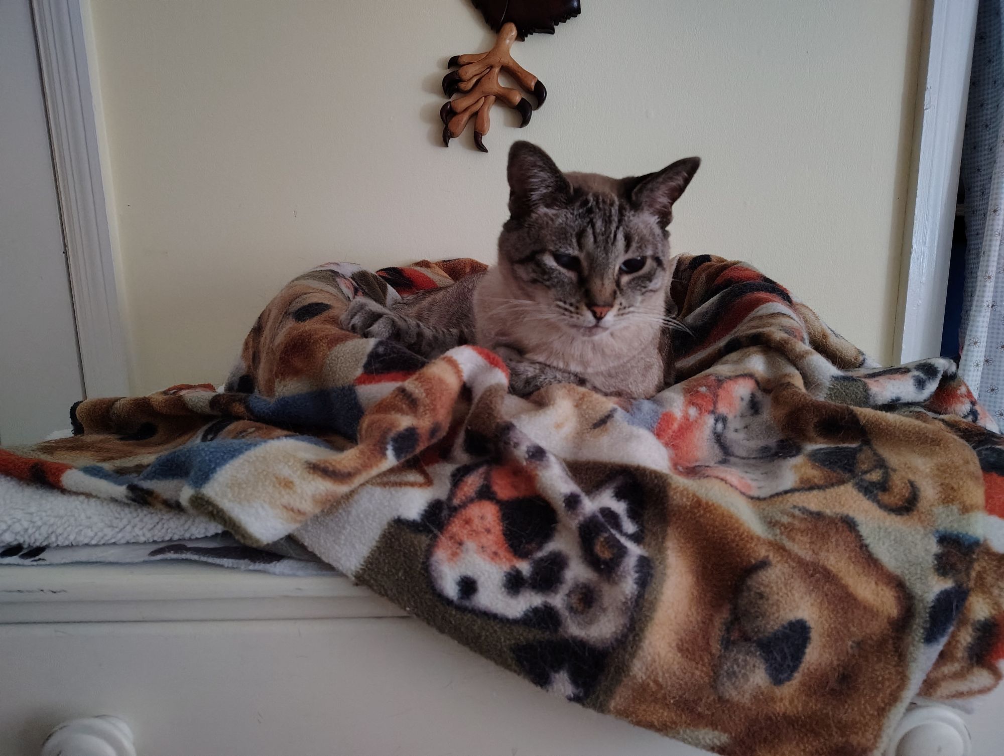 When Charles mother passed away, we became new parents to her cats. Jess is very comfortable here. This was taken today and he was making muffins on the ring of his bed and purring. They have lived with us over two years now.