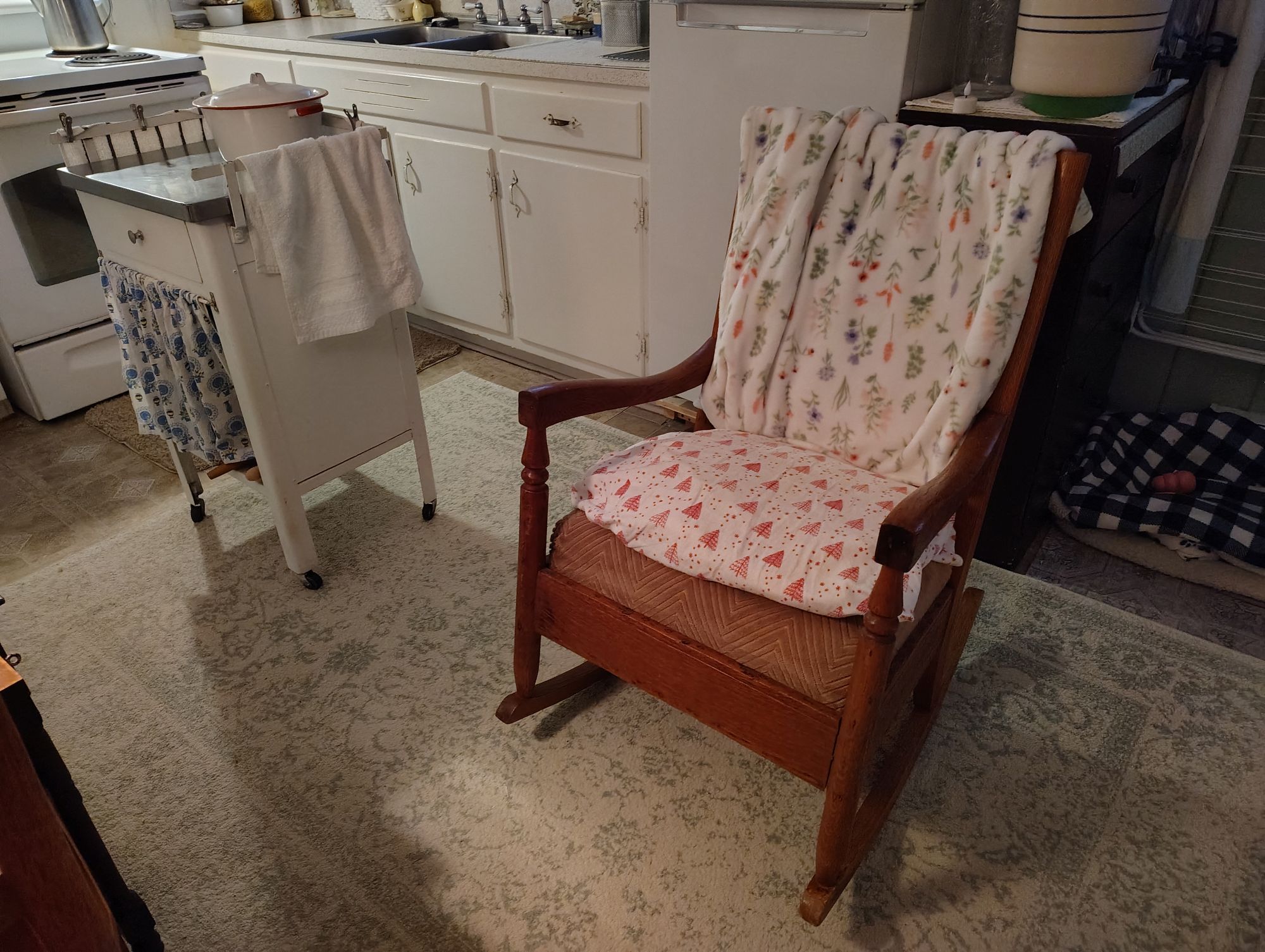 The rocker can be turned to face the table and other chairs and one more chair at my small desk making seating for eight.
