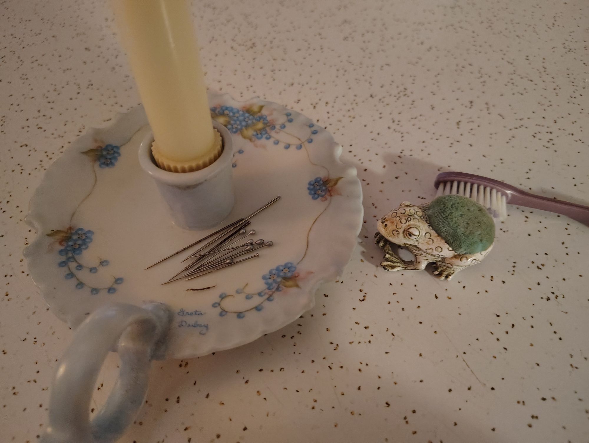 I have been working on getting the small clutter under control. When I have something that I need to do I have a tendency to take it from its place so I can work on it and then it sits out of place until I can get to it. I have three vintage pin cushions and they had gotten dusty and so this week I took the time to remove the pins and needles and I used a old toothbrush I use for household cleaning and I cleaned the pin pads on the pin cushions. Just taking the time to do this small task made me feel better.