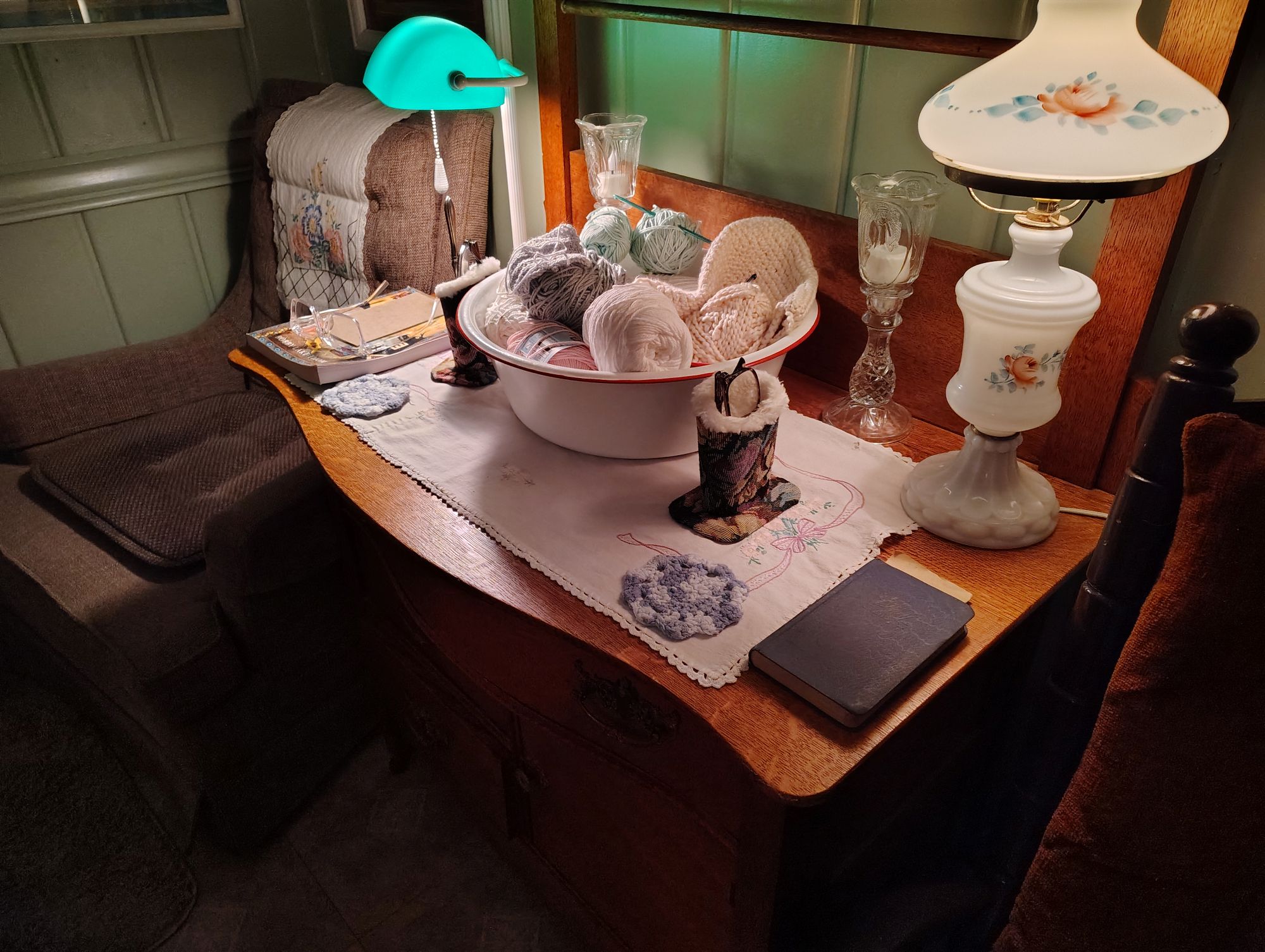This space is where Charles and I read, or I crochet or do needlework. I have had yarn projects in different parts of the house for the past couple of months and I finally decided to put a big bowl close to where I sit and so I can just put it there for easier access and easier to put it out of the way. I sit in the rocker on the right and Charles chair is there on the left. I like to switch up with different projects, that is just how my brain works.