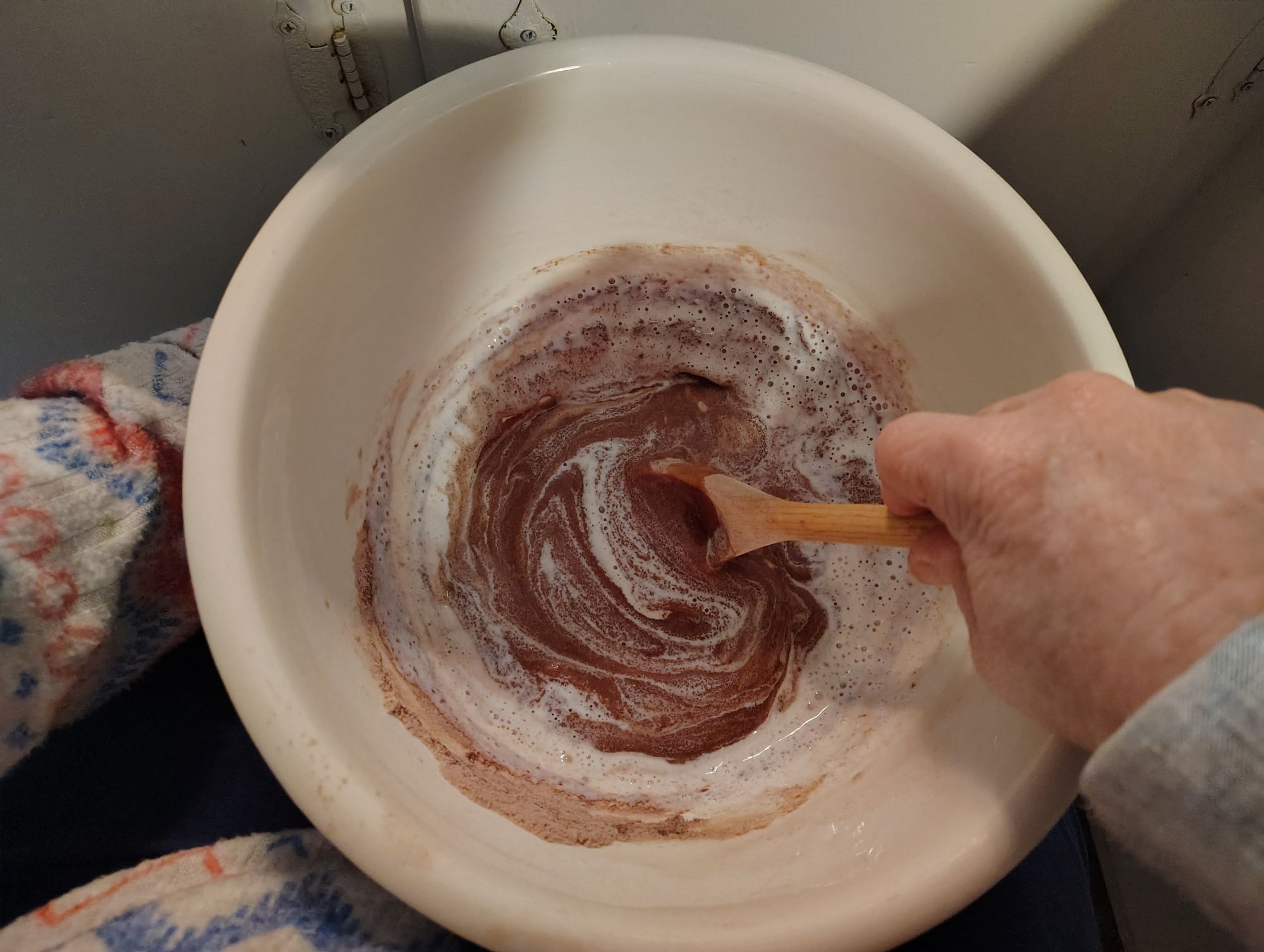 I have been changing the way that I make baked goods.  I have been converting my recipes to hand mixing with a spoon instead of using a electric mixer. This above is a chocolate cake, now I can sit in my little wooden kitchen chair and use a bowl and spoon to mix my batters when baking and no electric mixer. This is more comfortable for me using my arms and I have issues with dizziness and there is a lot of turning around in the kitchen when making baked goods.
