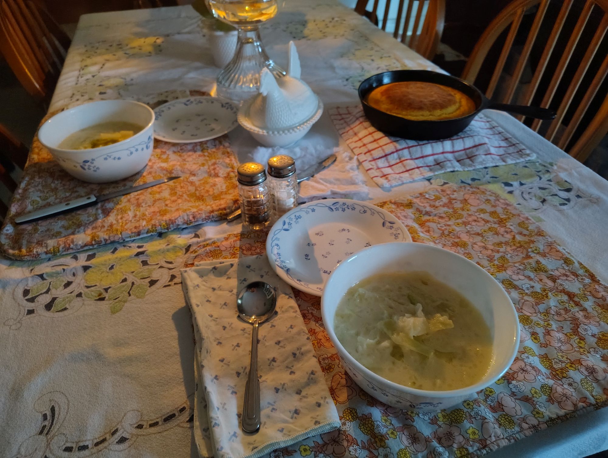 Today I made potato cabbage soup and cornbread. I could have used  the heat from the oven to heat the house by opening the door to the oven when the baking is done. It was warmer today so the kitchen was not cold.