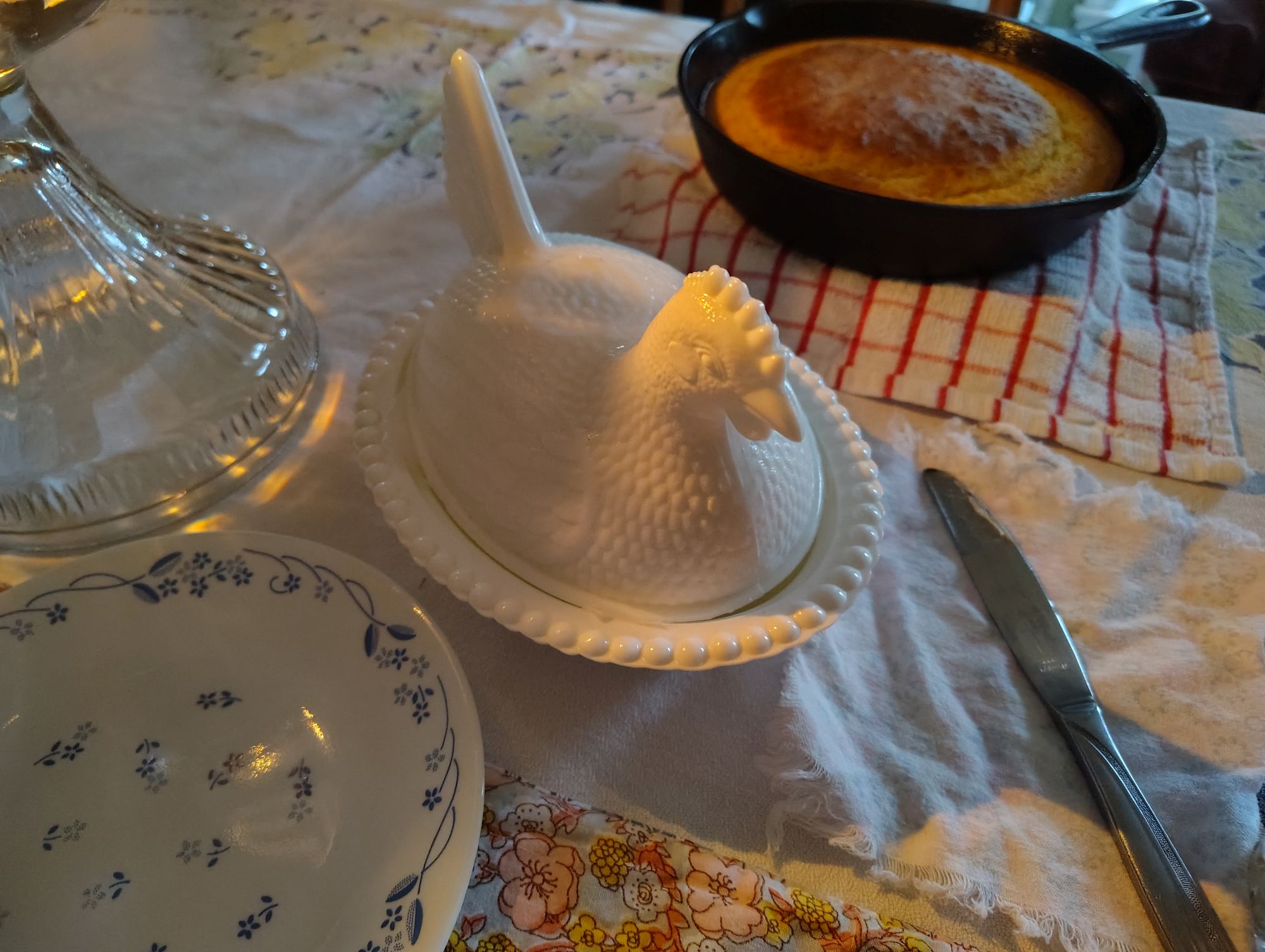 I put some butter in the chicken butter dish so it would come to room temperature while cooking the potato soup.