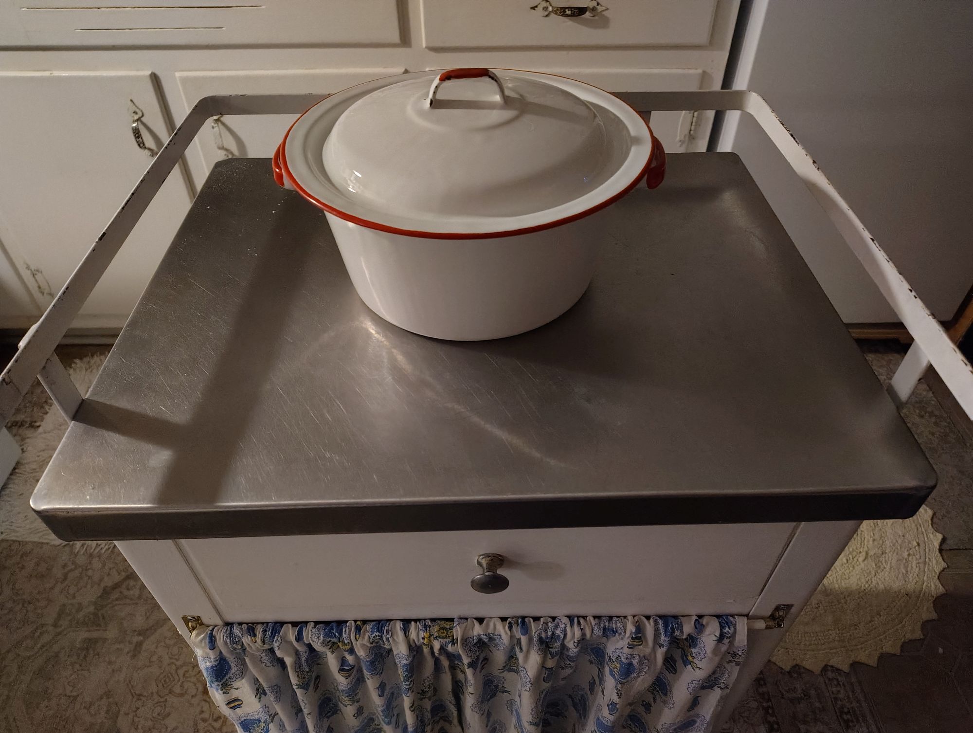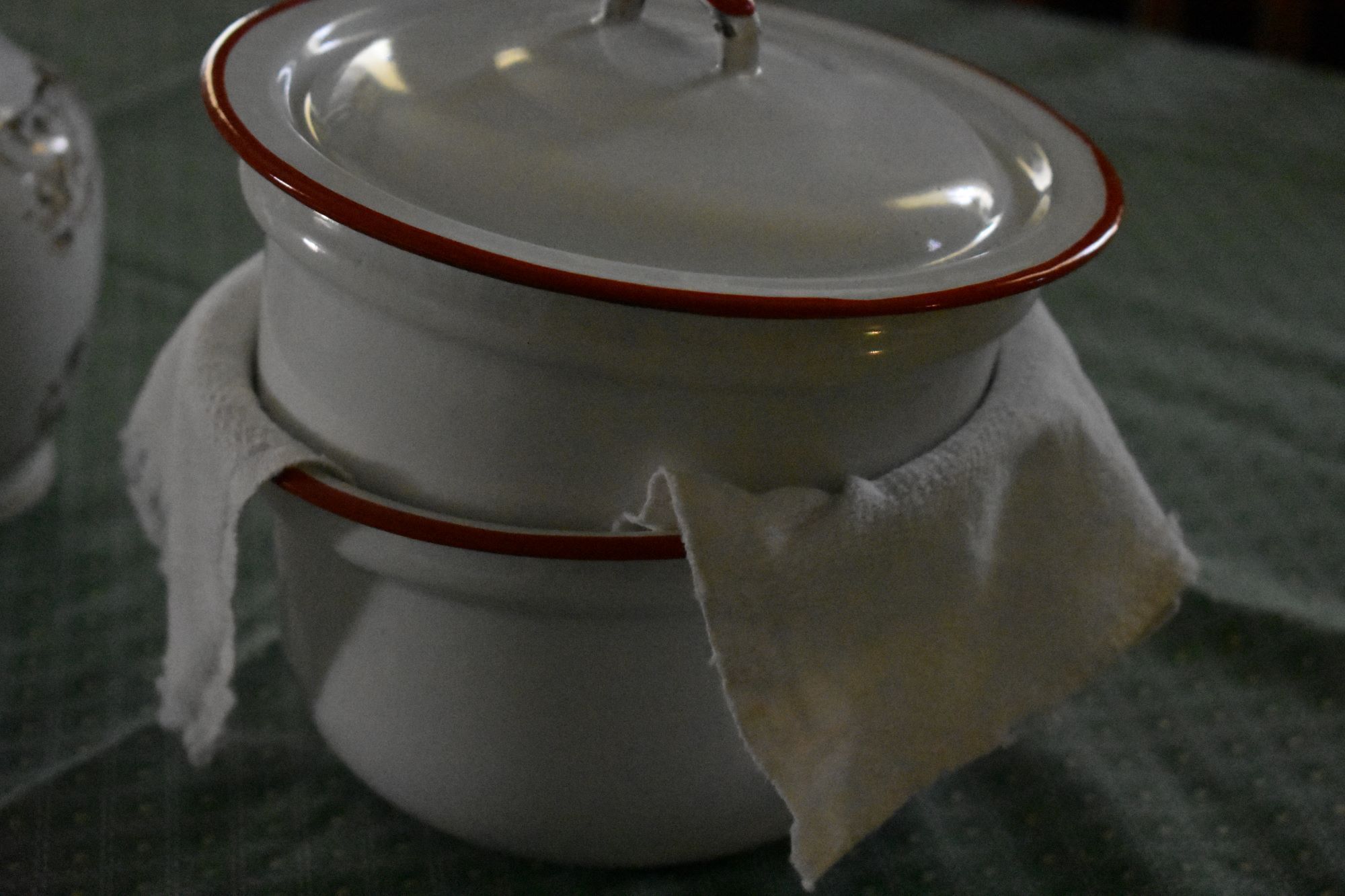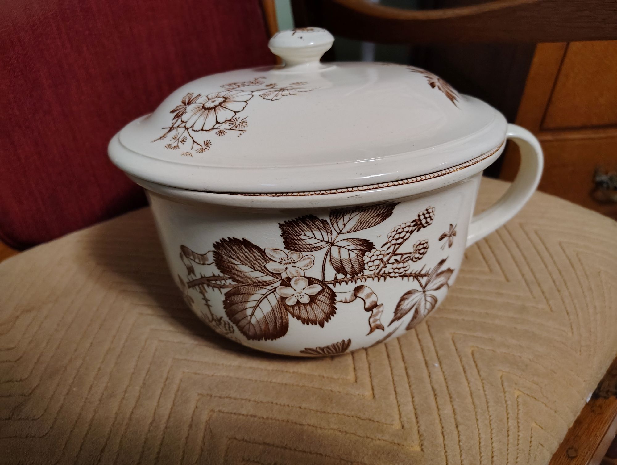 The chamber pot can be ceramic, porcelain or and enamel pot with lid  short enough to slide under the bed to use for urination during the night.