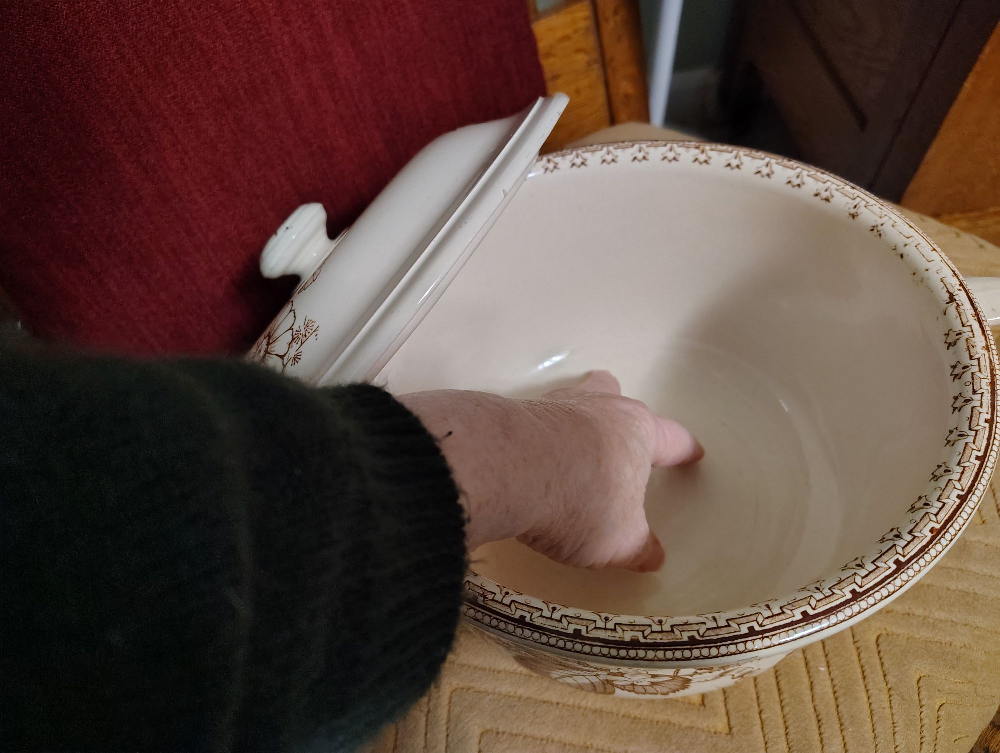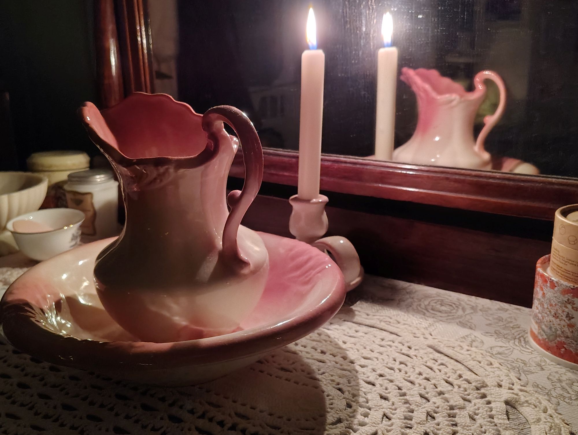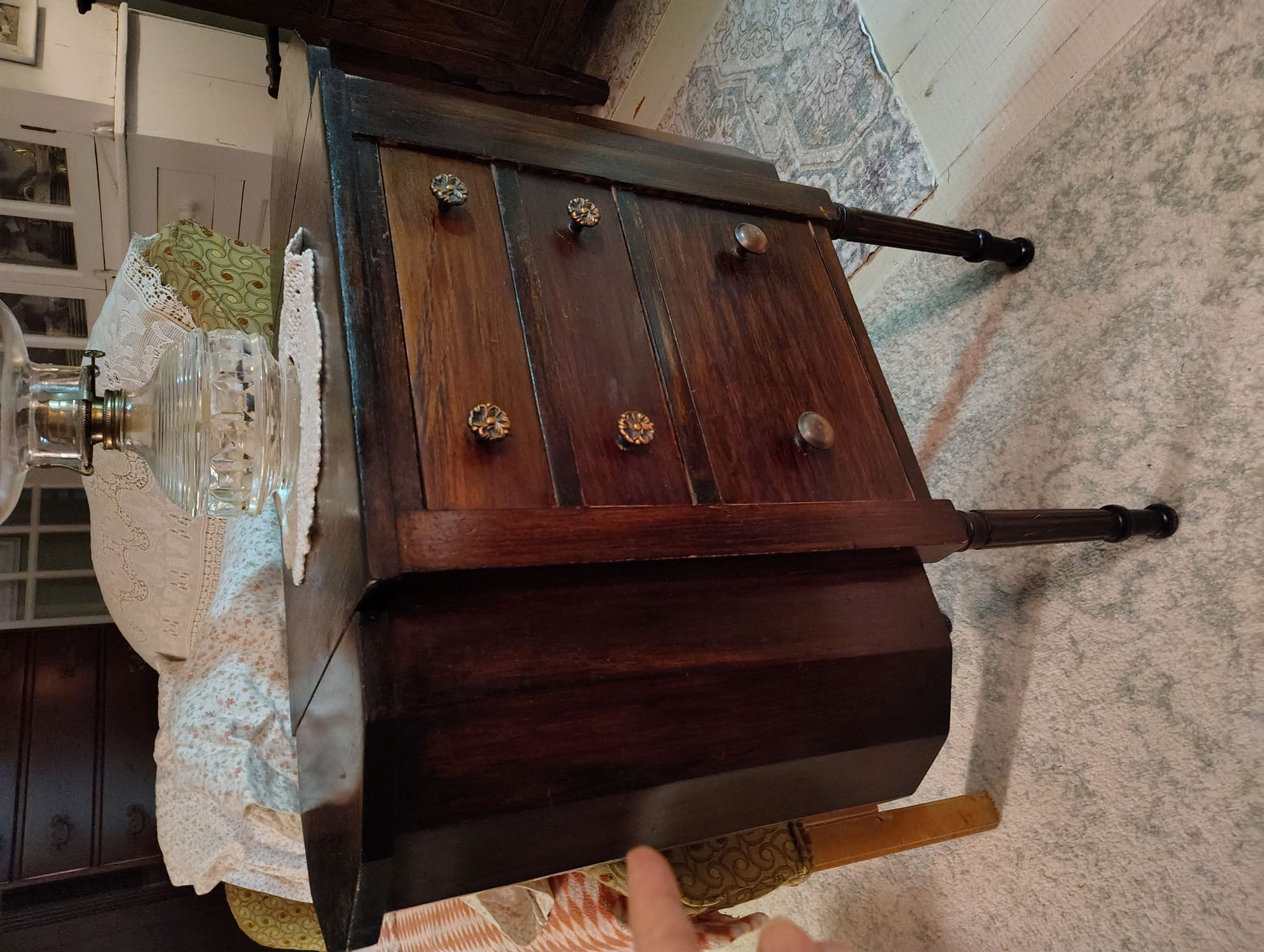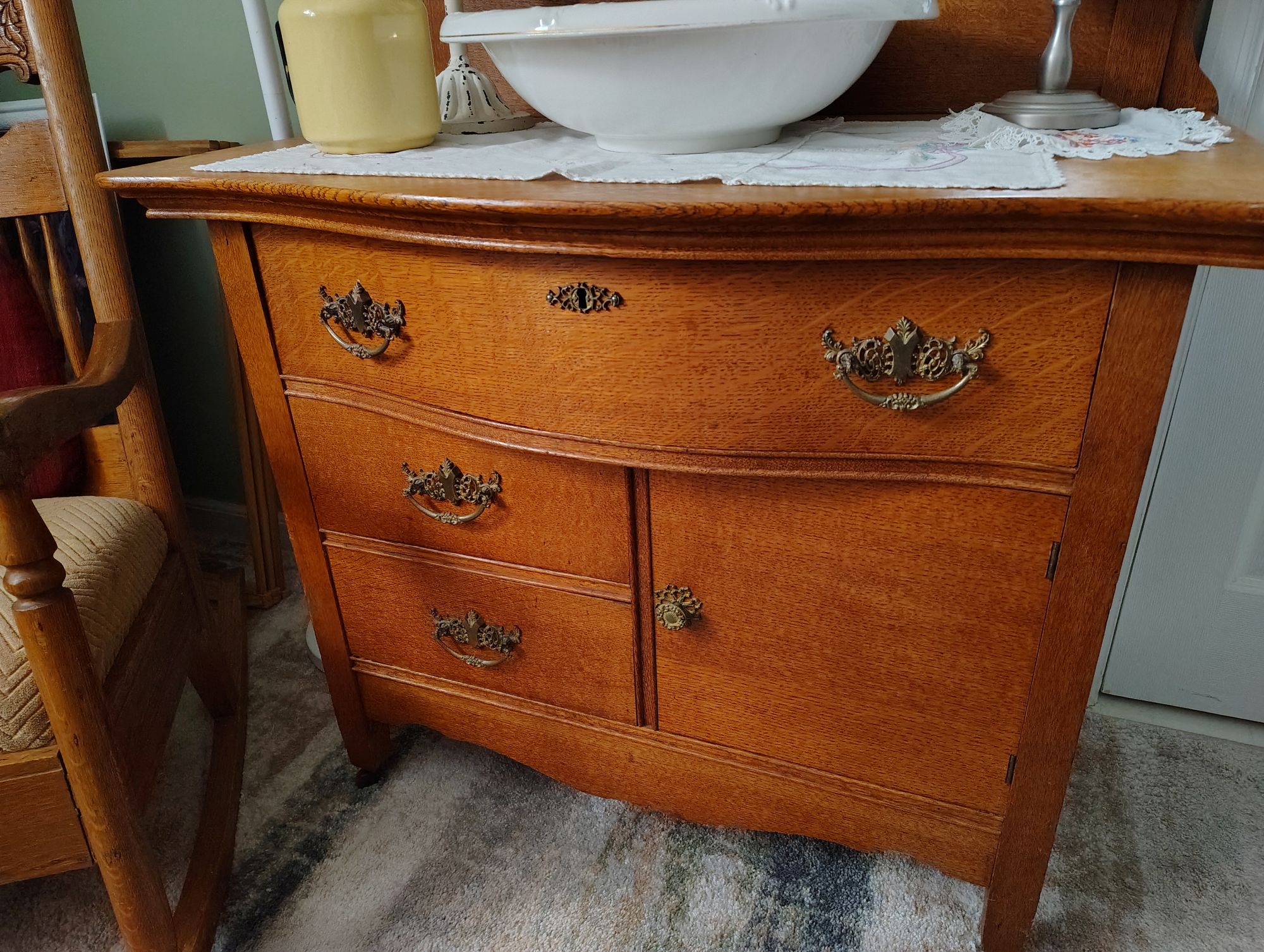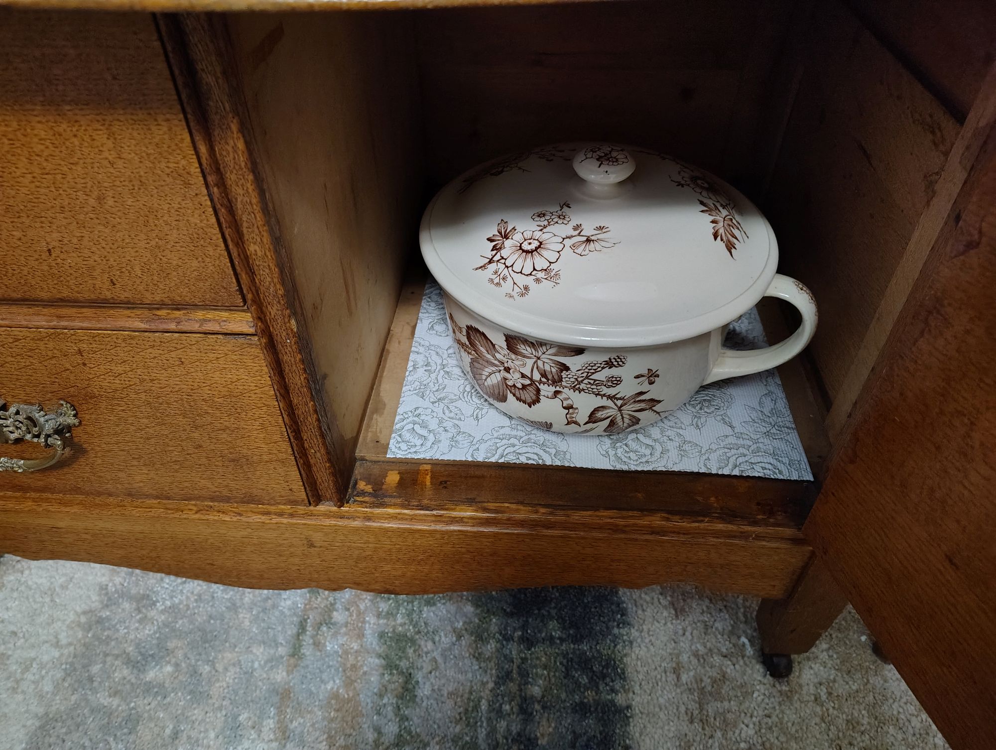 Many of the antique washbowl cabinets have a place to hold the slop pot or chamber pot. The slop pot is for carrying out the used water from the washbowl.