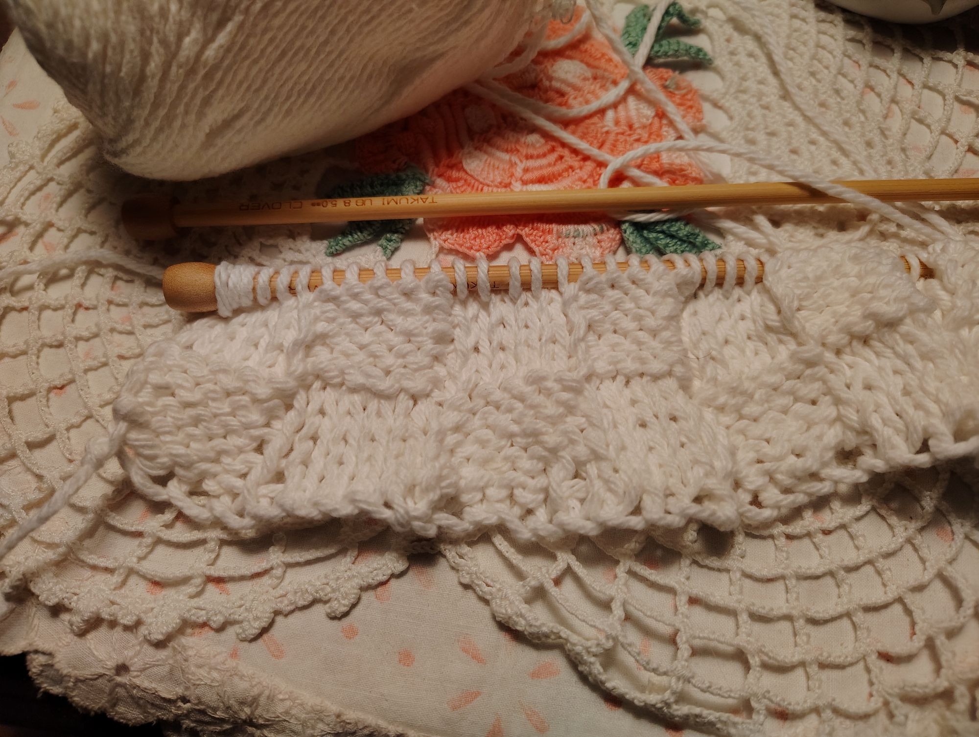 The instructions for the Knit and Purl cloth:  cast on 40, knit five, purl five, to the end, the last one will be knit. knit five rows.