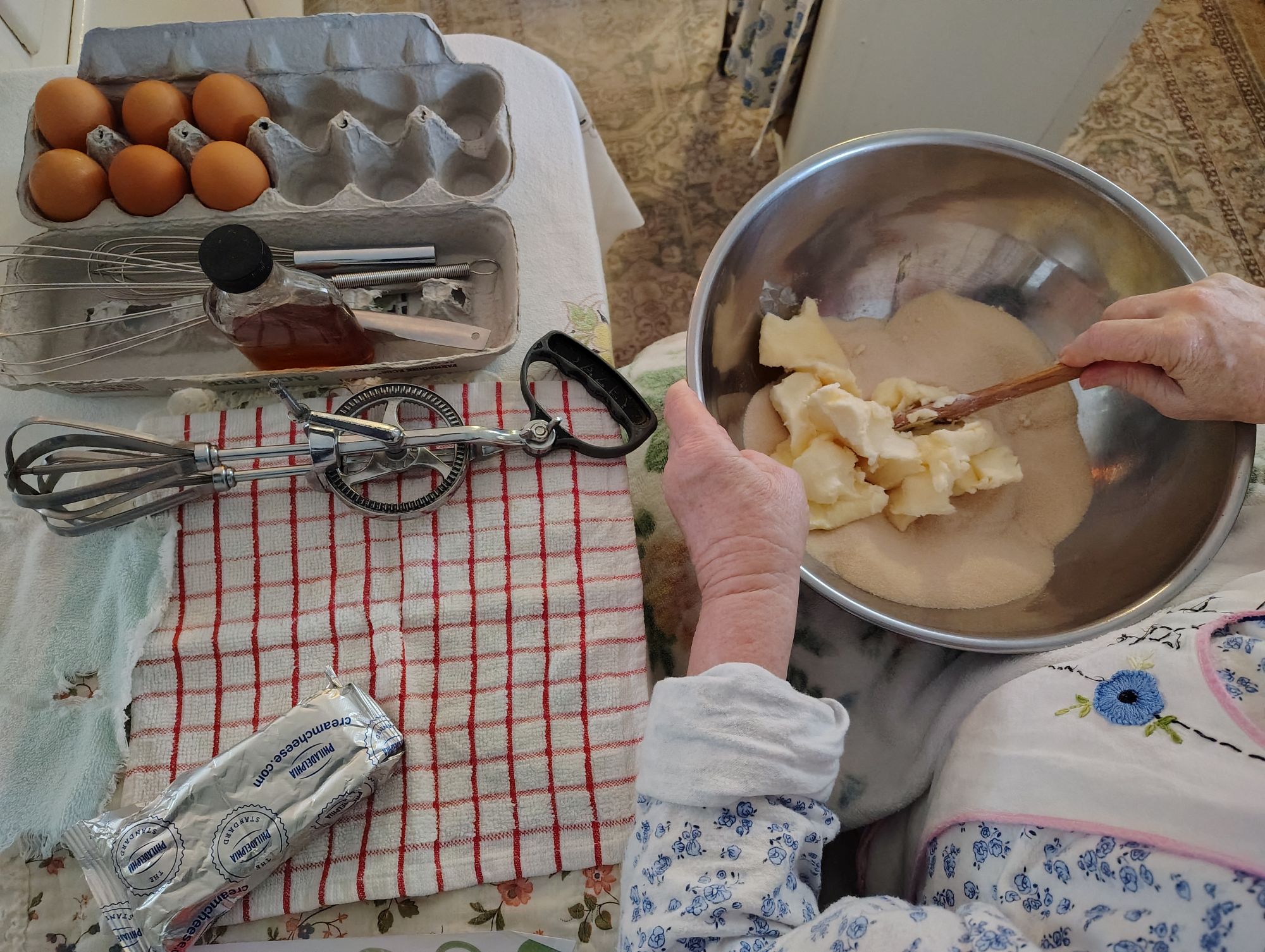 So I sat myself down in a kitchen chair with a pillow and towel in my lap and still in my warm flannel pajamas and an apron, I set a large bowl in my lap with some sugar and butter and went to work hand mixing a cream cheese pound cake. I used the recipe that I have always use when making this pound cake, I got out some simple kitchen tools that I though would help to end up with a fluffy, thickish batter.