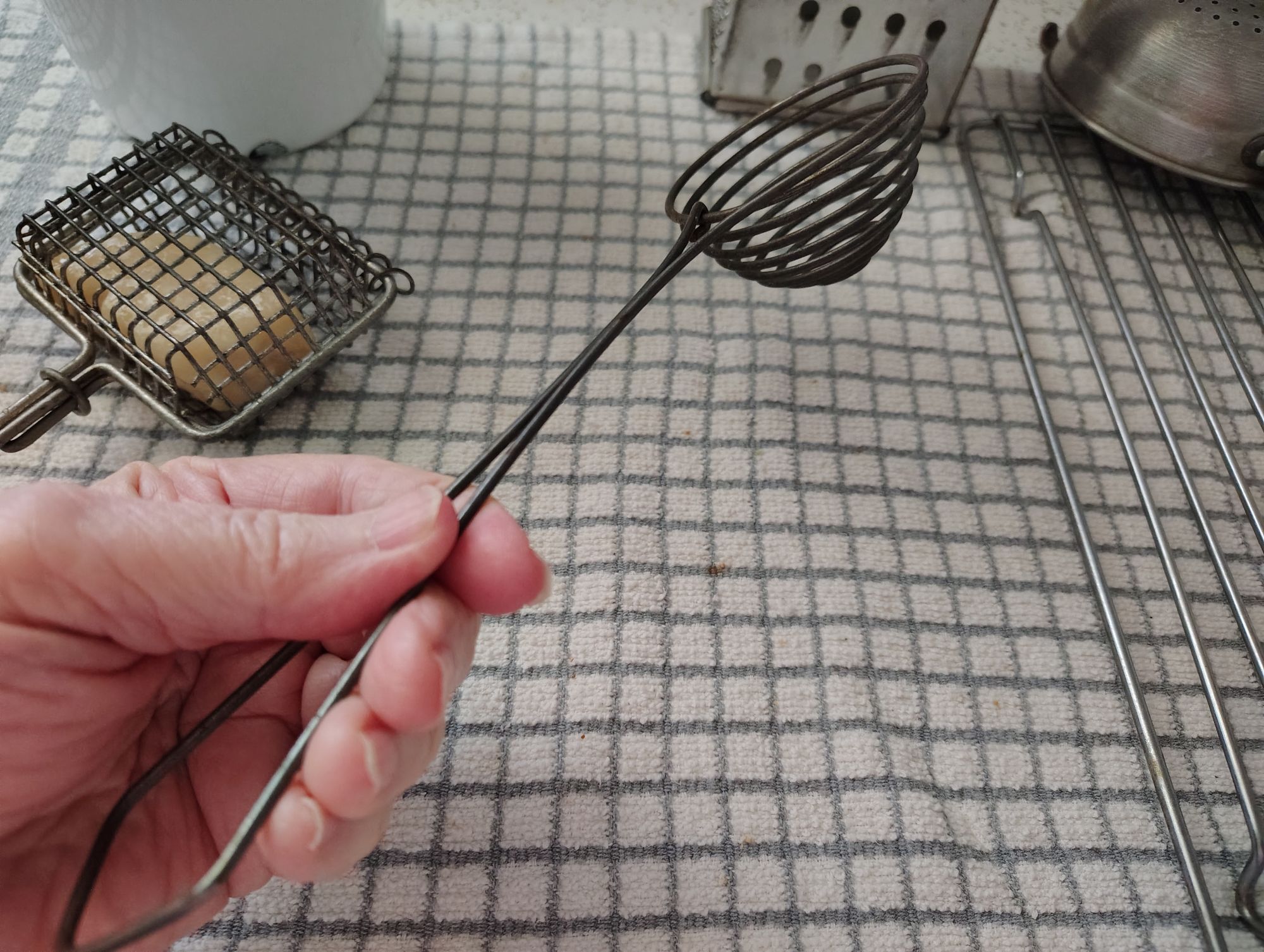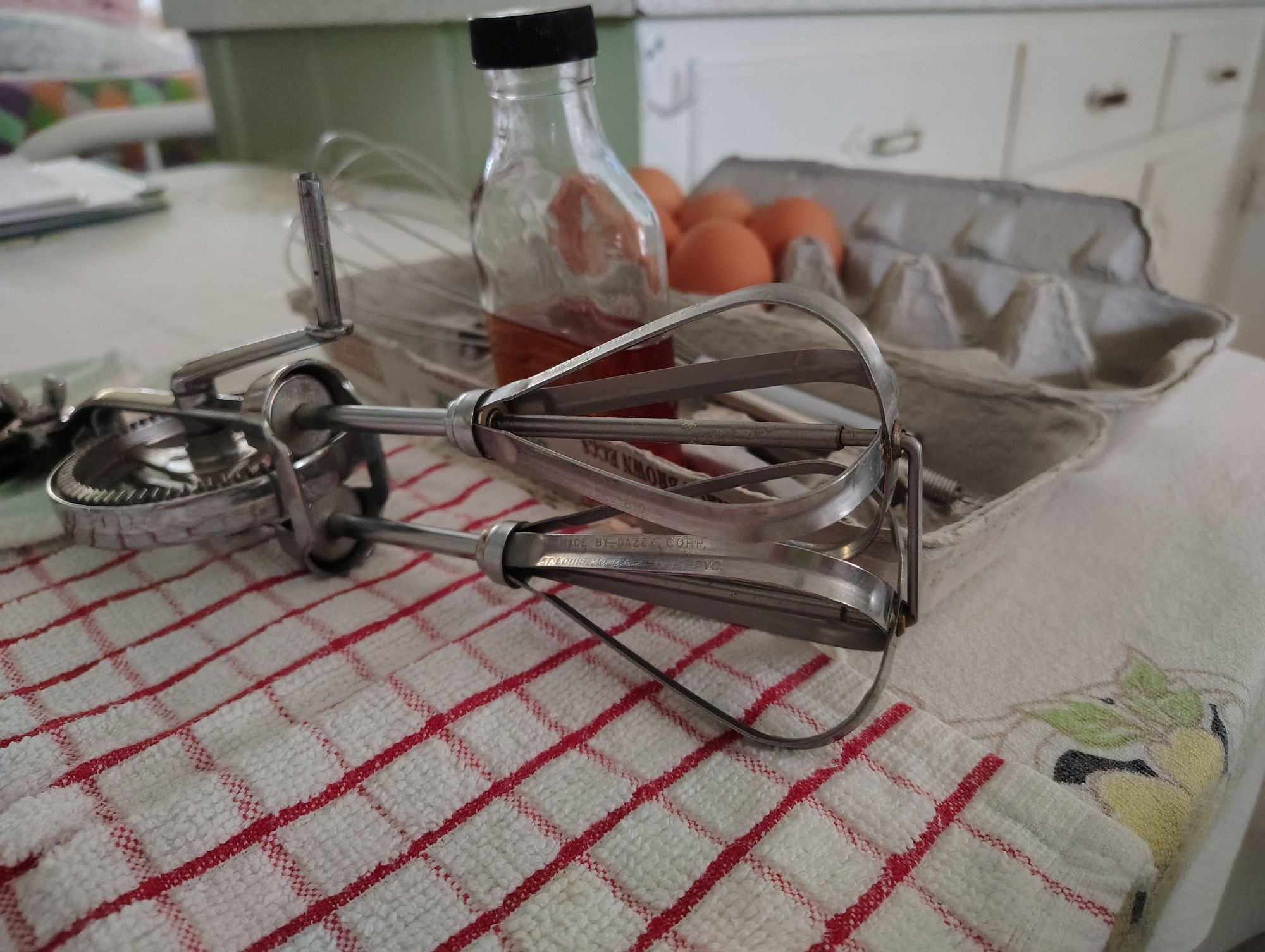 I beat the eggs in with the vintage rotary hand beater but knew that I would not be able to beat the flour because it would be too thick.