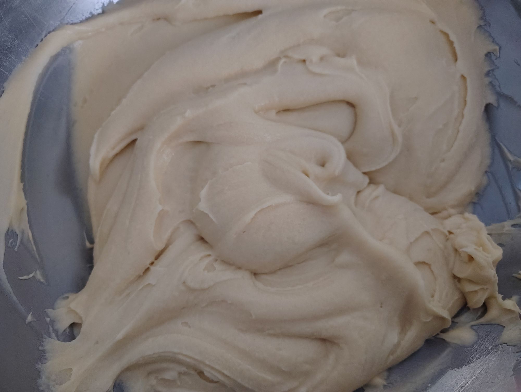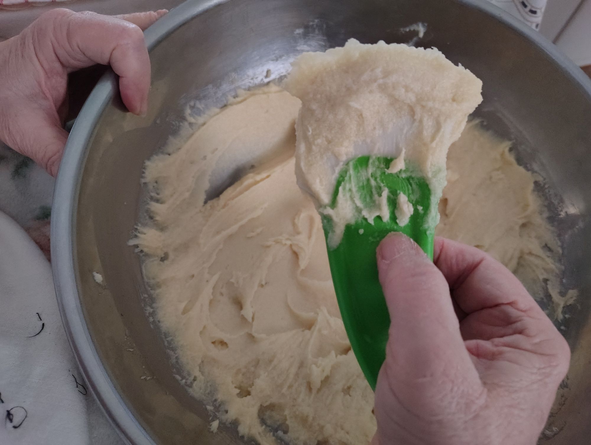 After I sifted a little of the flour at a time into the mix and added the vanilla I mixed it well with a wood spoon and my little rubber scraper thing.