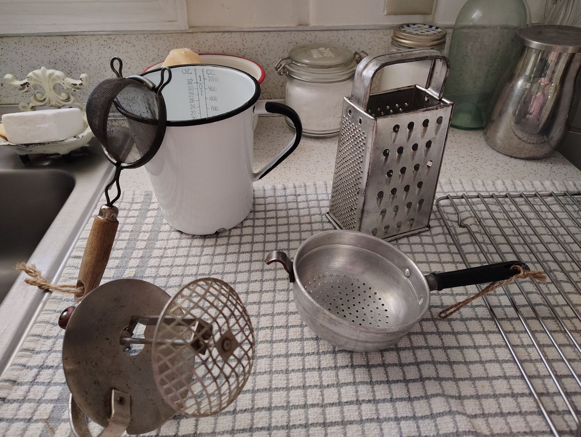 I like the smaller size box grater, the strainer with the clip on the end. The large enamel measuring cup. I am not too fond of the front left mixer to make mayonnaise. We have not mastered this tool at this time.