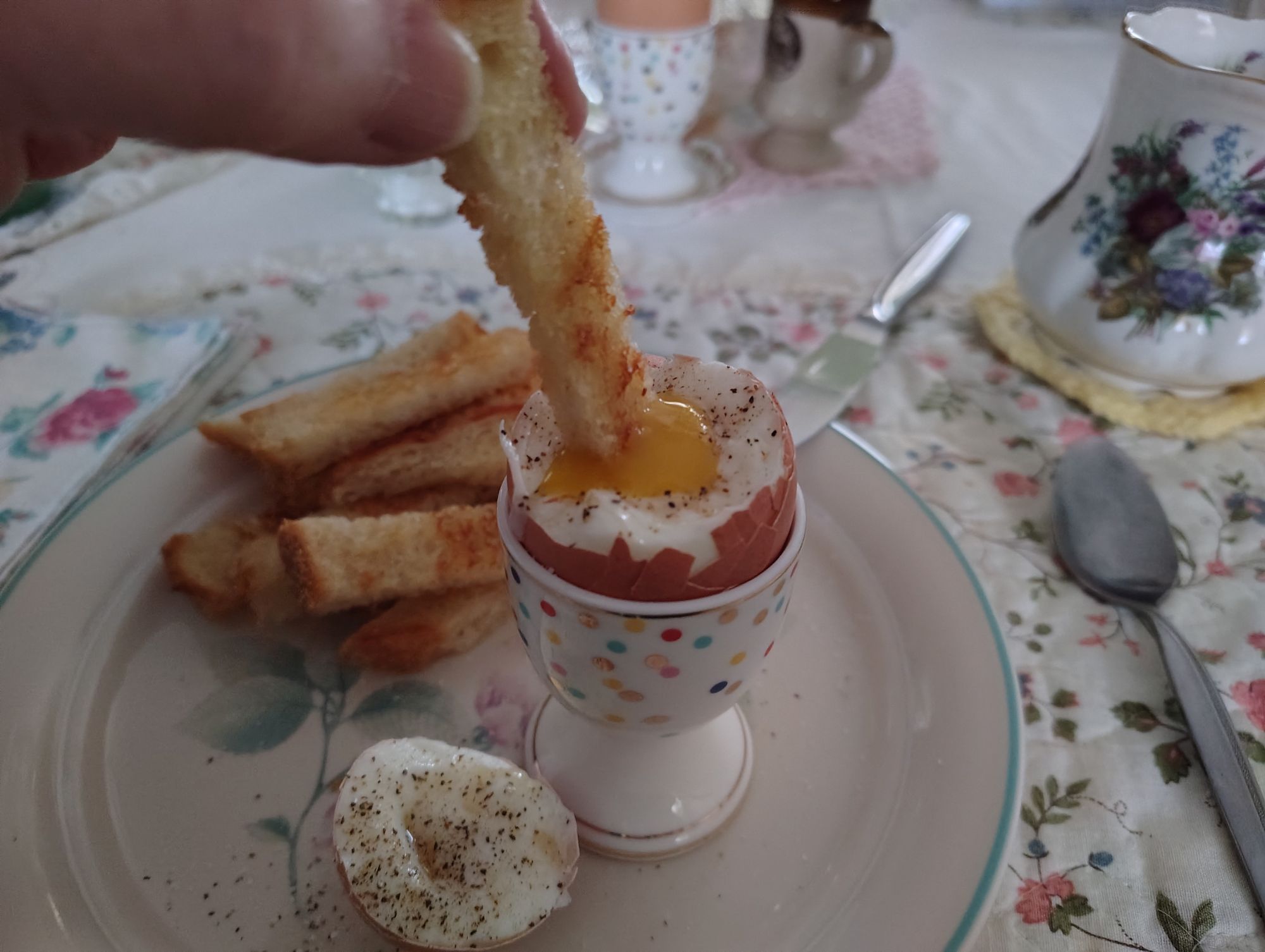 We got up this morning and we ate a simple breakfast as one would have eaten in 1941. I washed the breakfast dishes by hand as it would have been in 1941. I cleaned and dusted, Charles helped me with the floors and he pushed the push vacuum and then went outside to do some work around the house while I worked inside. I knitted for a little while. Then there was lunch work.