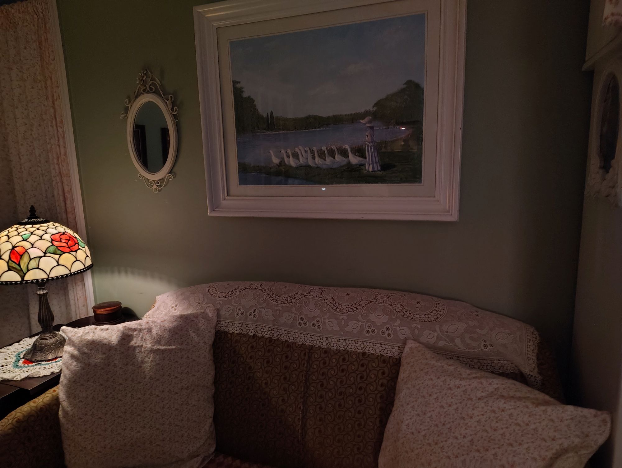 The photo shown above is of a large framed picture that belonged to a family member but was being thrown out because it was old and very faded. I rescued it from the curb and brought it home. I carefully pulled the back off and removed the picture from the glass and frame and repainted the entire scene and brought it back to life.