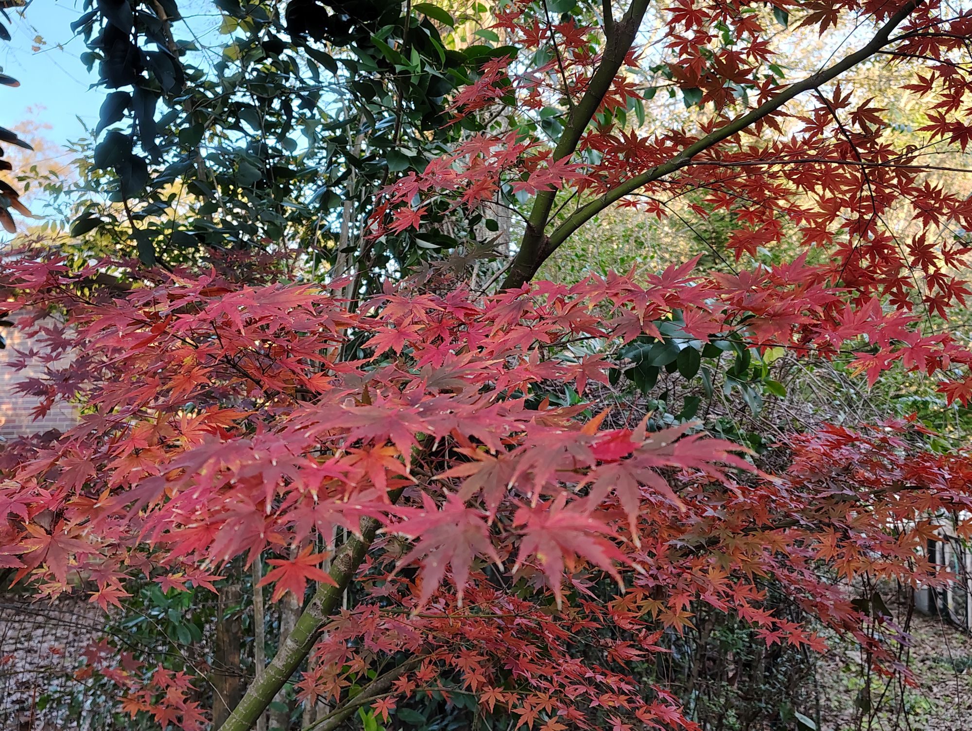 The trees that lose their leaves during winter are almost bare now, but the Japanese maple is just beautiful with it's vibrant color. It brings happiness to our yard.