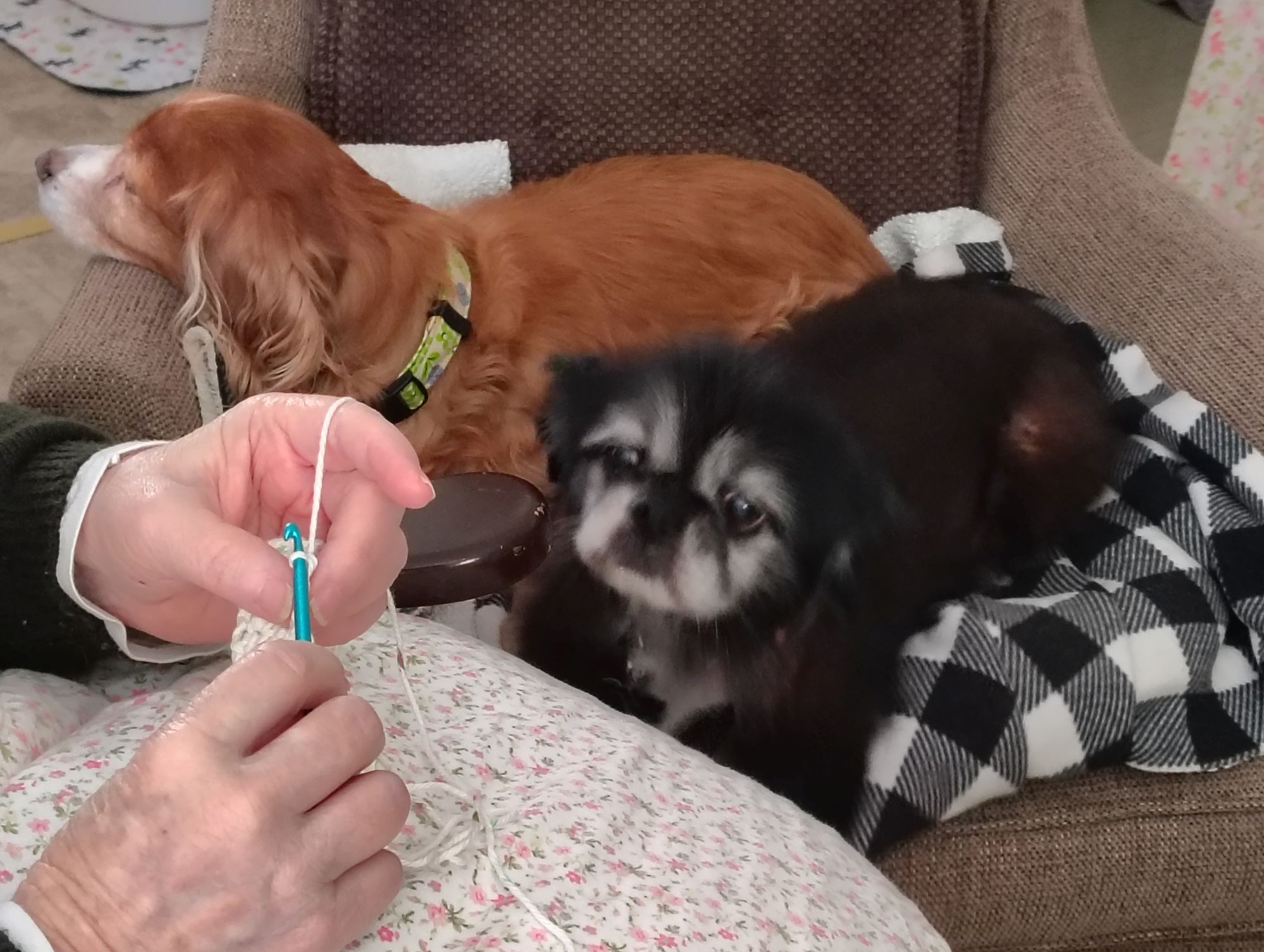 Bernadette is listening to me telling her about my crochet bathcloths for Baby Jude.